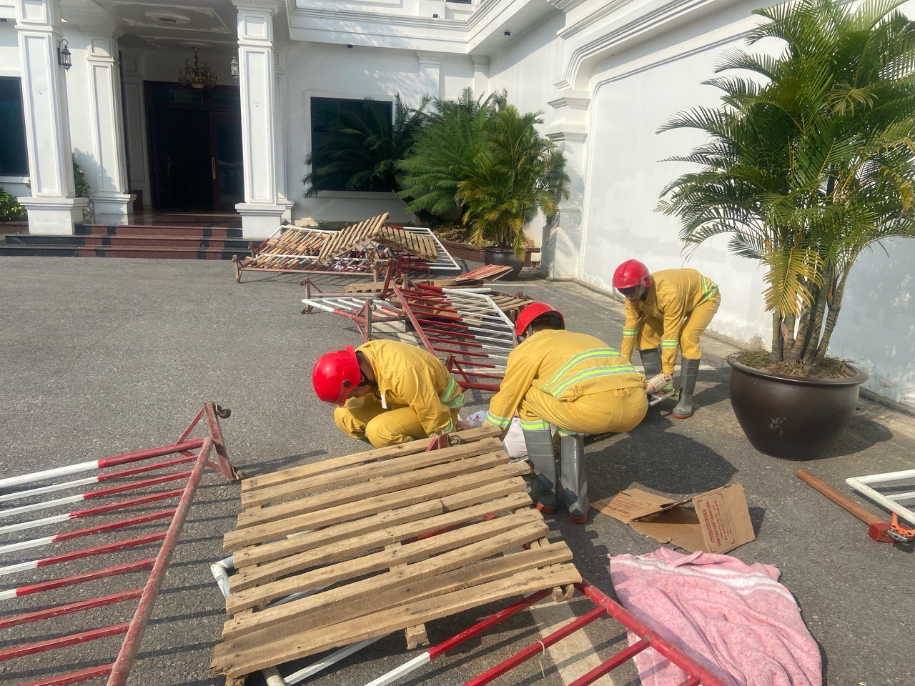 Với tình huống giả định vào hồi 14h00, ngày X/Y/Z, Tại Nhà hàng Hoa Ban có địa chỉ tại Phố Giắt, thị trấn Triệu Sơn. Do nhu cầu sử dụng, Chủ cơ sở đã tiến hành cải tạo mở rộng thêm tại vị trí tầng 1 và tầng 2 của Toà Nhà. Trong quá trình thi công do thợ chủ quan lắp đặt các giàn giáo chưa được chắc 3 chắn dẫn đến toàn bộ giàn giáo thi công và các vât liệu xây dựng đổ sập vào công nhân xây dựng tại tầng 1, tầng 2 và tủ điện của toà nhà. Lúc này có 3 công nhân đang sử dụng thang máy để đi xuống tầng 1 không thoát ra được. 5 Công nhân đang sửa chửa tầng 2, do Cầu thang bộ đã bị dỡ bỏ để cải tạo từ trước và tháng máy không sử dụng được dẫn đến mắc kẹt tại tầng 2, trong đó có 2 công nhân bị thương ở chân do bị cấu kiện rơi vào. Tại vị trí tầng 1, lúc này có 3 Công nhân đang trát xi ở phía dưới dẫn đến bị toàn bộ giàn giáo thi công sụp đổ đè lên người dẫn đến bị mắc kẹt dưới cầu kiện không thể thoát ra được.