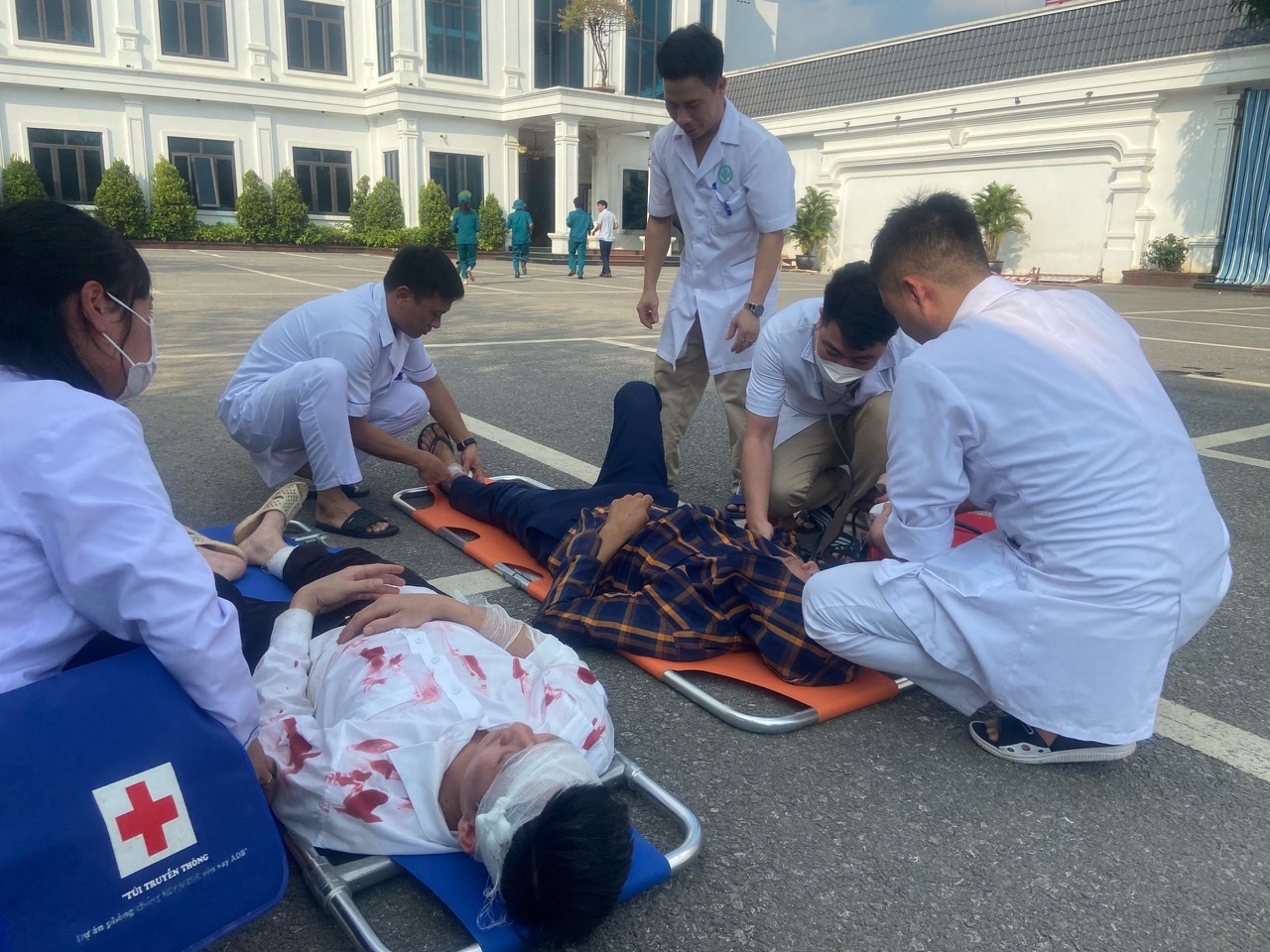Với tính huống giả định cuộc diễn tập được chia làm 3 giai đoạn cụ thể: giai đoạn 1: Sau khi nghe hô hoán của bảo vệ, các lực lương đã nhanh chóng tập hợp tìm kiếm nạn nhân xác định được trước mắt có 2 nạn nhân đang bị mắc kẹt, 1 người bị nạn ở bên trong toà nhà, 1 người bị nạn ở dưới cấu kiện giàn giáo. Sau đó hỗ trợ triển khai 2 đồng chí chạy vào nhà 3 tầng cõng 1 nạn nhân ra vị trí tập kết có sơ cấp cứu. 3 đồng chí còn lại chạy ra nơi giàn giáo bị đổ, mang bỏ các cấu kiện đang đè nạn nhân, sau đó dìu nạn nhân về vị trí tập kết. Lực lượng y tế tại chỗ tiến hành băng bó cho các nạn nhân.