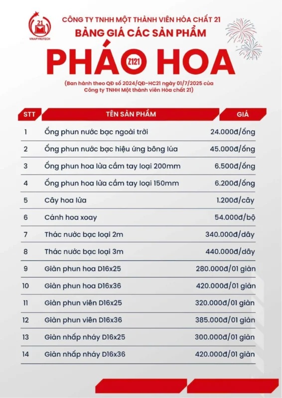 Cuối năm luôn là thời điểm nhu cầu sử dụng pháo hoa tăng mạnh, đặc biệt khi các gia đình chuẩn bị cho Tết Nguyên đán và các lễ hội lớn. Nhằm giúp người dân dễ dàng tra cứu, Nhà máy Z121 – Bộ Quốc phòng đã công bố bảng giá pháo hoa dân dụng không tiếng nổ áp dụng từ 01/07/2025, tiếp tục sử dụng cho mùa lễ Tết 2026.