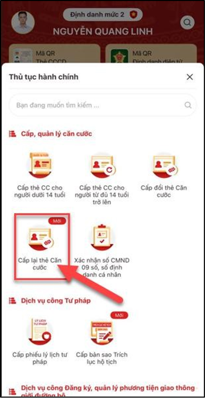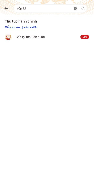 + Cách 2: Tại màn hình trang chủ à Chọn chức năng tìm kiếm à Tại ô tìm kiếm nhập tên chức năng Cấp lại thẻ Căn cướcà Hiển thị kết quả tìm kiếm à Chọn Cấp lại thẻ Căn cước