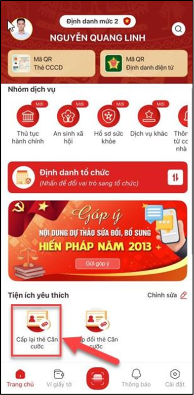 + Cách 3: Trường hợp công dân đã đưa chức năng Cấp lại thẻ Căn cước vào danh sách tiện ích yêu thích: Tại màn hình trang chủ, mục Danh sách tiện ích à Chọn chức năng Cấp lại thẻ Căn cước