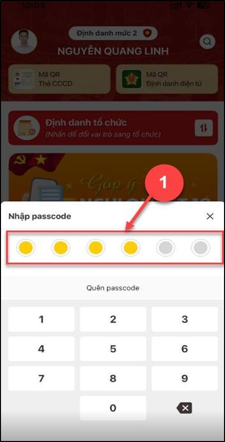 + Công dân không nhớ passcode nhấn Quên passcode để thực hiện thiết lập lại passcode