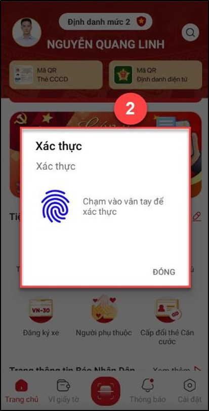 Công dân nhập đúng passcode hoặc thực hiện xác thực bằng vân tay/ khuôn mặt.