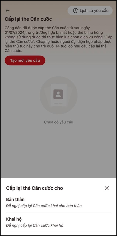 Hình 5 Màn hình chọn Cấp lại thẻ Căn cước ở Tiện ích yêu thích
