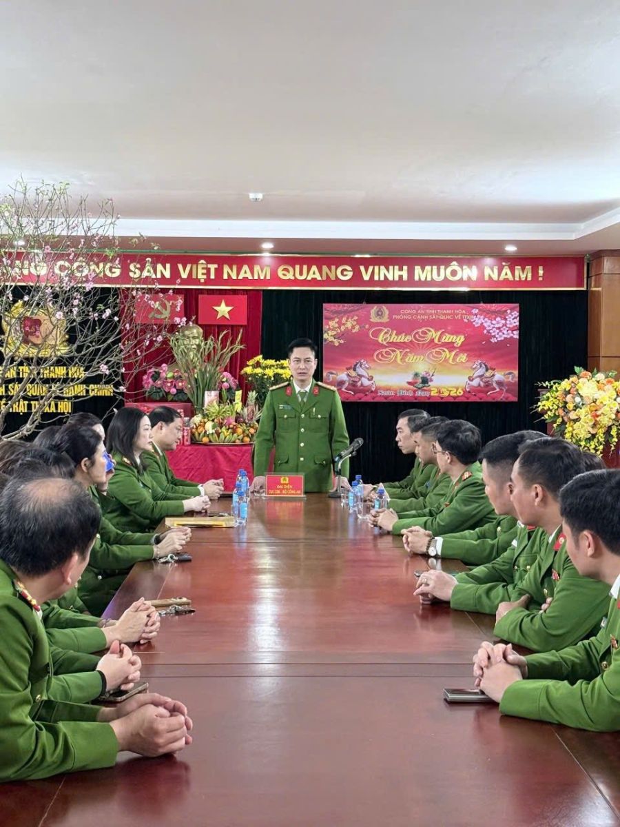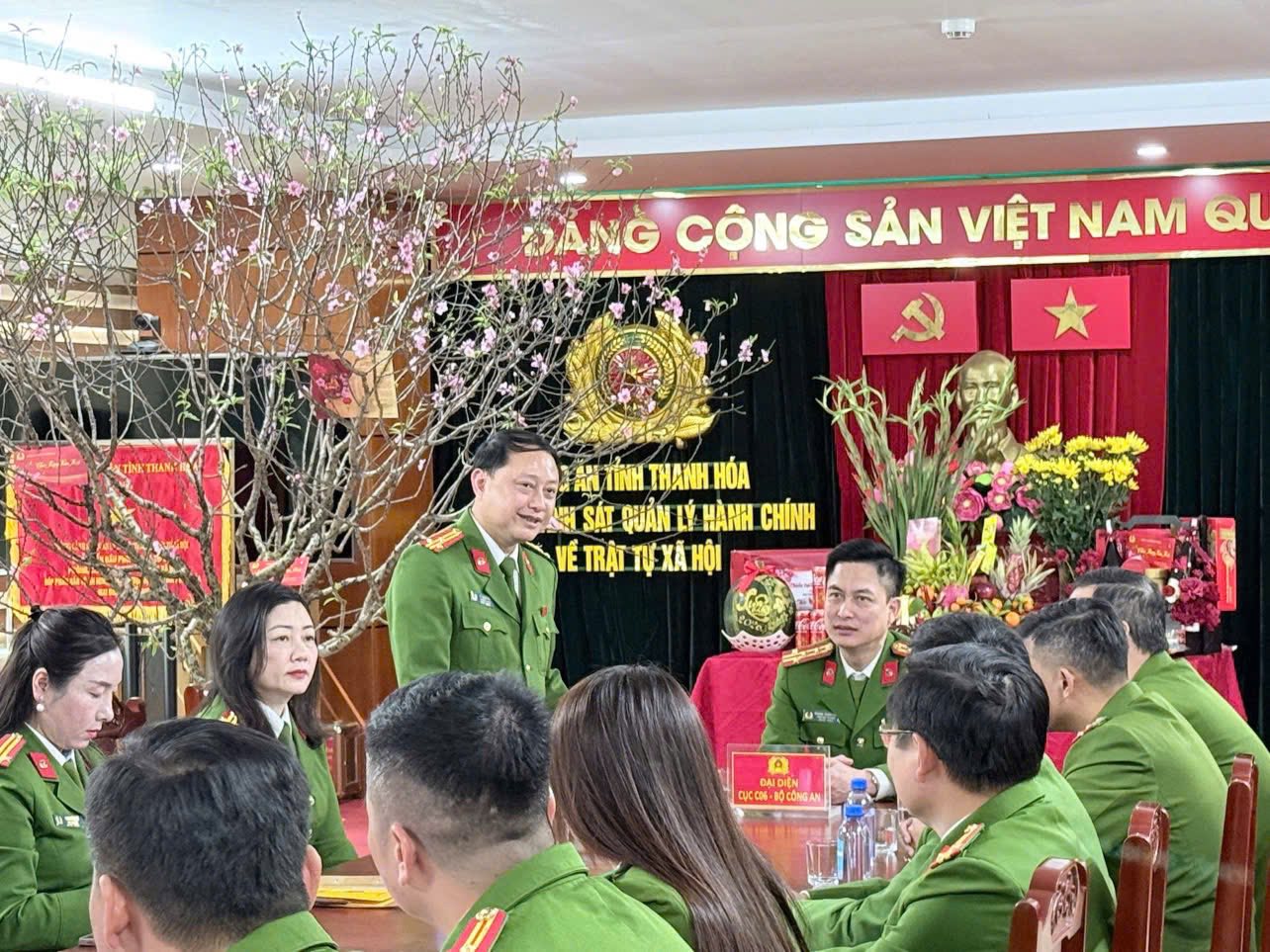 Sáng ngày 13/02/2026, đồng chí Đại tá Phùng Xuân Tiến - Phó Cục trưởng Cục Cảnh sát Quản lý hành chính về trật tự xã hội (QLHC về TTXH) đã đến: (1) Kiểm tra tiến độ, kết quả thực hiện các mặt công tác trọng tâm trong đợt cao điểm tấn công, trấn áp tội phạm, bảo đảm an ninh, trật tự Đại hội đại biểu toàn quốc lần thứ XIV của Đảng, bầu cử Đại biểu Quốc hội khóa XVI, Hội đồng nhân dân các cấp nhiệm kỳ 2026-2031, Tết Nguyên đán Bính Ngọ 2026 và các sự kiện lớn của đất nước, các lễ hội đầu năm và (2) thăm, chúc tết CBCS Phòng Cảnh sát QLHC về TTXH Công an tỉnh Thanh Hóa.