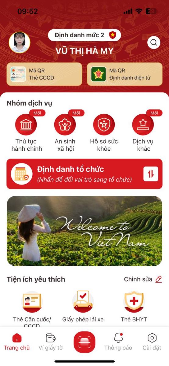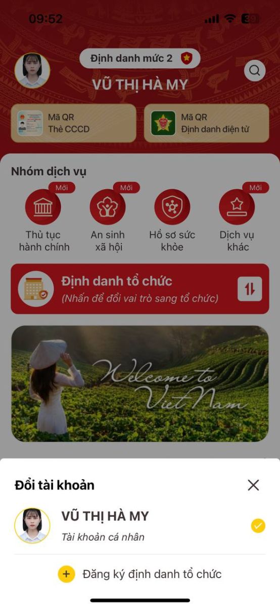 Đăng nhập ứng dụng VNeID, tại màn hình trang chủ tài khoản định danh điện tử mức 2 nhấn Định danh tổ chức.