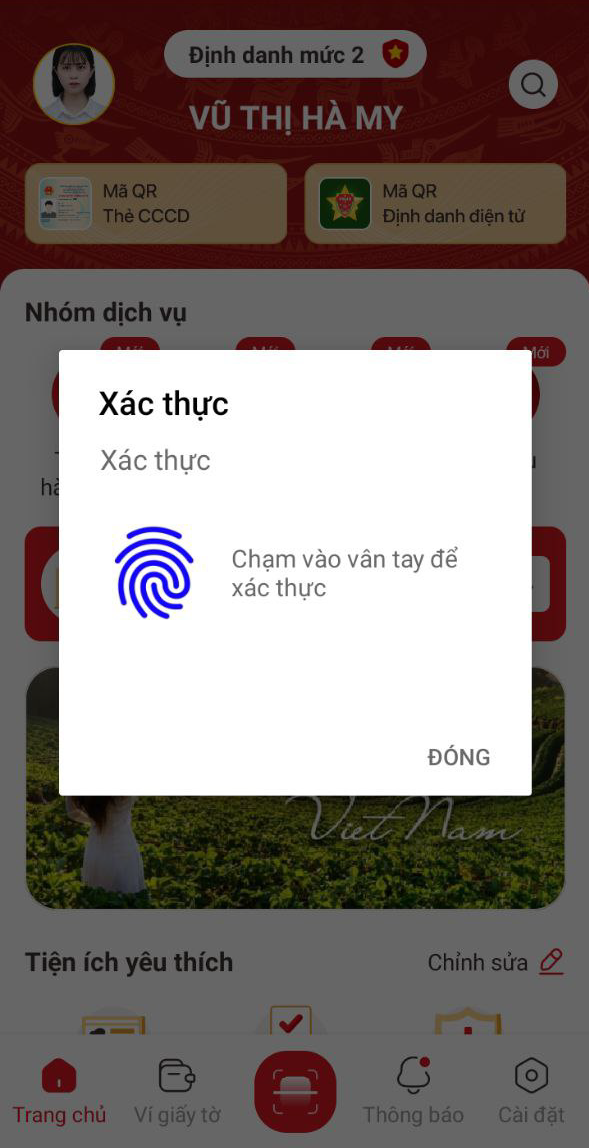 Trường hợp công dân đã cài đặt phương thức xác thực bằng vân tay (Touch ID) thay thế nhập passcode