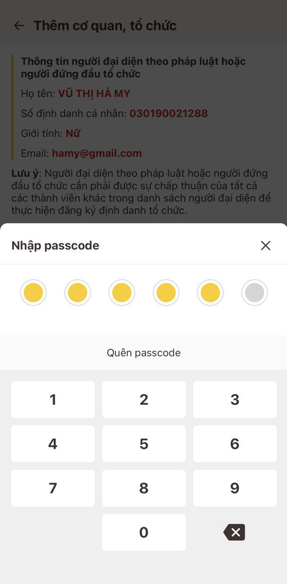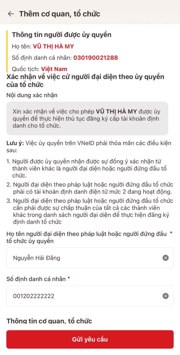 - Nhập thông tin của người ủy quyền đăng ký định danh tổ chức