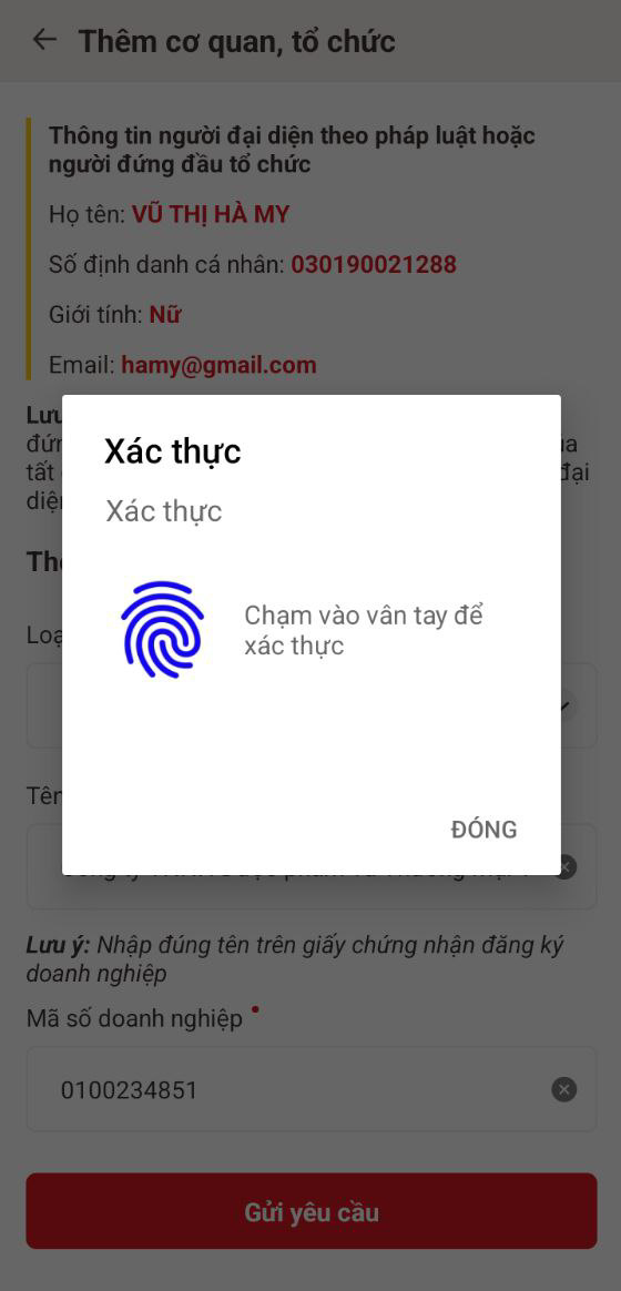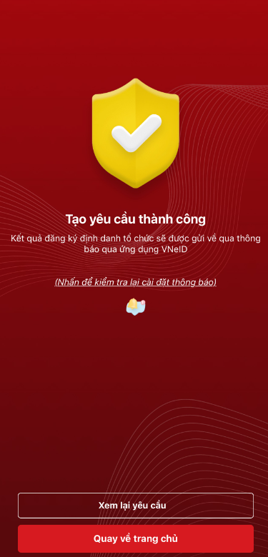 Công dân đã tạo yêu cầu đăng ký thành công, kết quả đăng ký định danh tổ chức sẽ được thông báo qua ứng dụng VNeID