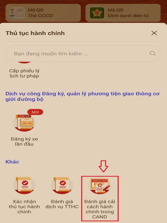 Để giúp người dân, doanh nghiệp thuận tiện hơn trong việc phản ánh ý kiến đối với các thủ tục hành chính của ngành Công an cung cấp và đánh giá thái độ phục vụ của cán bộ chiến sĩ khi tiếp công dân giải quyết thủ tục hành chính, Bộ Công an đã triển khai thực hiện lấy ý kiến đánh giá cải cách hành chính trong Công an nhân dân qua ứng dụng VNeID. Các bước thực hiện như sau: