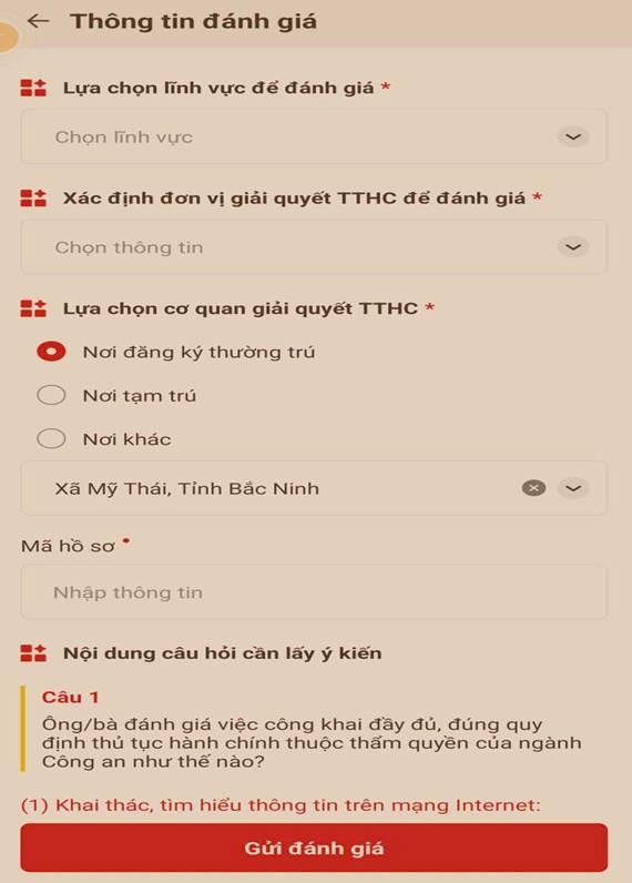 - Lựa chọn lĩnh vực đánh giá (lĩnh vực thuộc thẩm quyền giải quyết của Phòng nghiệp vụ cấp tỉnh hoặc Công an các xã, phường);