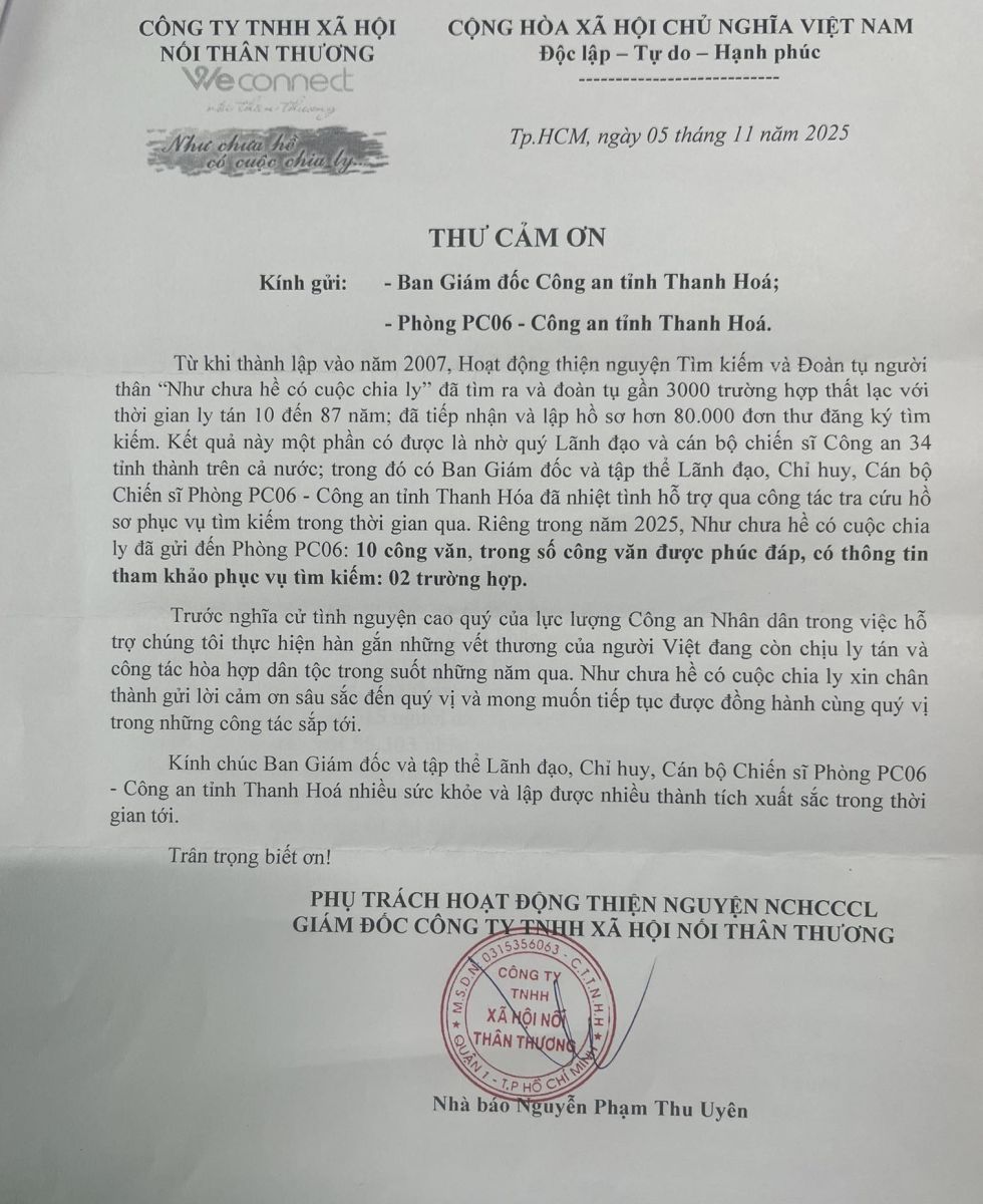 Riêng trong năm 2025, đơn vị đã tiếp nhận và cung cấp thông tin giúp Chương trình “Như chưa hề có cuộc chia ly” tìm kiếm, kết nối được 02 trường hợp đoàn tụ. Mới đây nhất, ngày 05/11/2025, Chương trình đã gửi thư cảm ơn Ban Giám đốc Công an tỉnh và Phòng Cảnh sát QLHC về TTXH vì sự hỗ trợ nhiệt tình, trách nhiệm trong công tác tra cứu hồ sơ, giúp tìm kiếm người thân bị thất lạc.