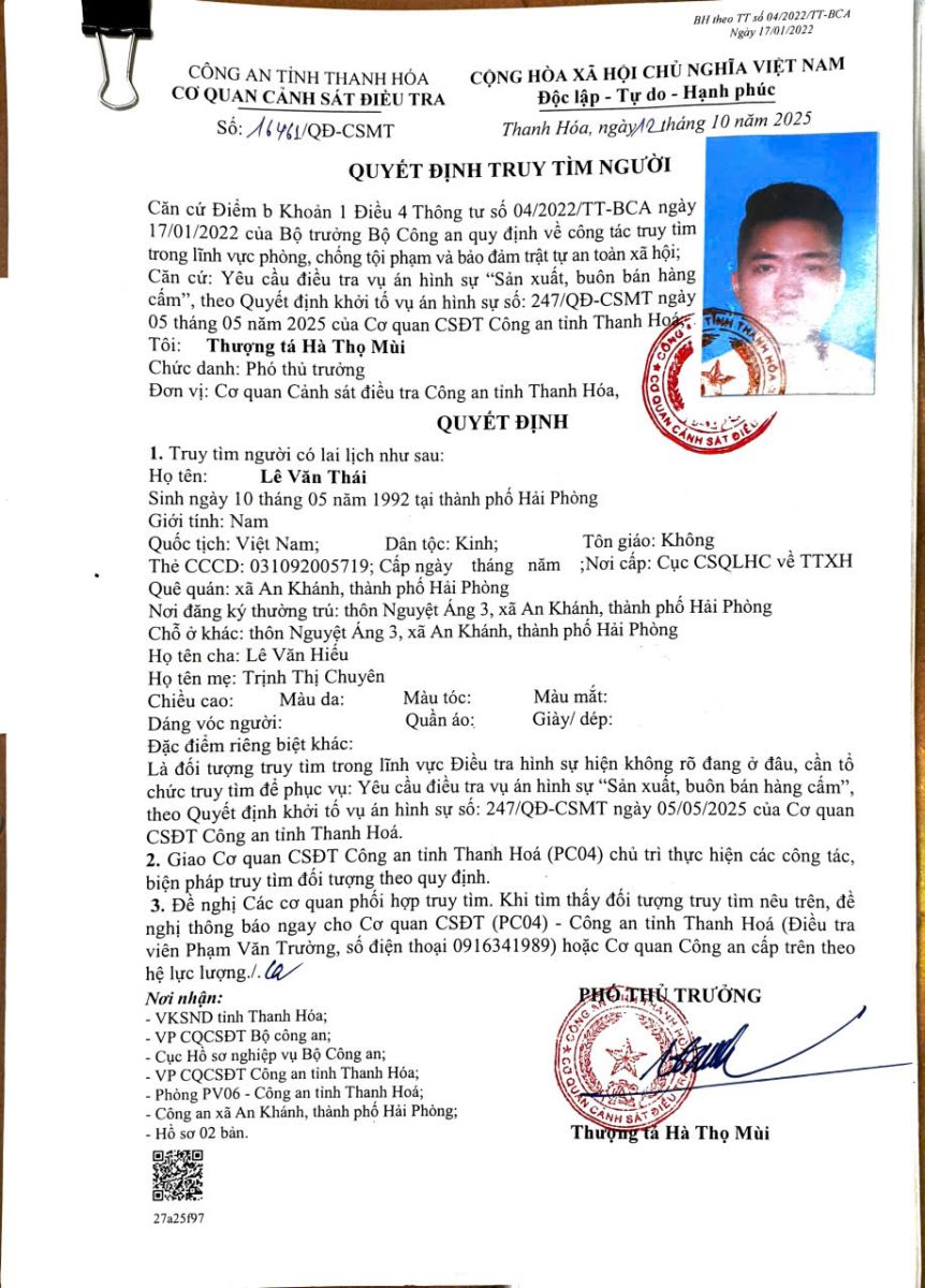 Cơ quan CSĐT Công an tỉnh Thanh Hóa đang điều tra vụ án" Sản xuất buôn bán hàng cấm" xảy ra tại TP Hà Nội và các địa phương từ ngày 01/03/2025 đến tháng 5/2025. Quá trình điều tra Lê Văn Thái là đối tượng có liên quan trong vụ án không có mặt tại địa phương, hiện không rõ đang ở đâu cần tổ chức truy tìm để phục vụ yêu cầu điều tra