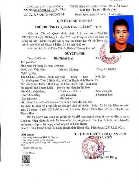 Quyết định truy nã số: C2292F/QĐTN-VPCQCSĐT