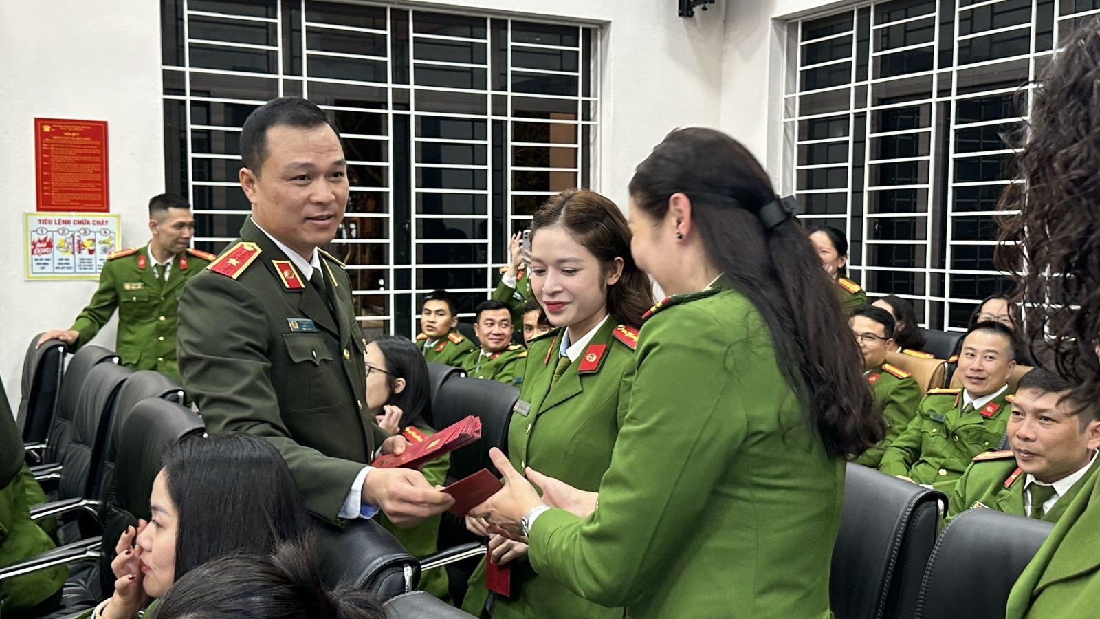Đồng chí Giám đốc Công an tỉnh lì xì, chúc Tết động viên các cán bộ, chiến sĩ Công an phường Hạc Thành làm nhiệm vụ trong đêm Giao thừa.