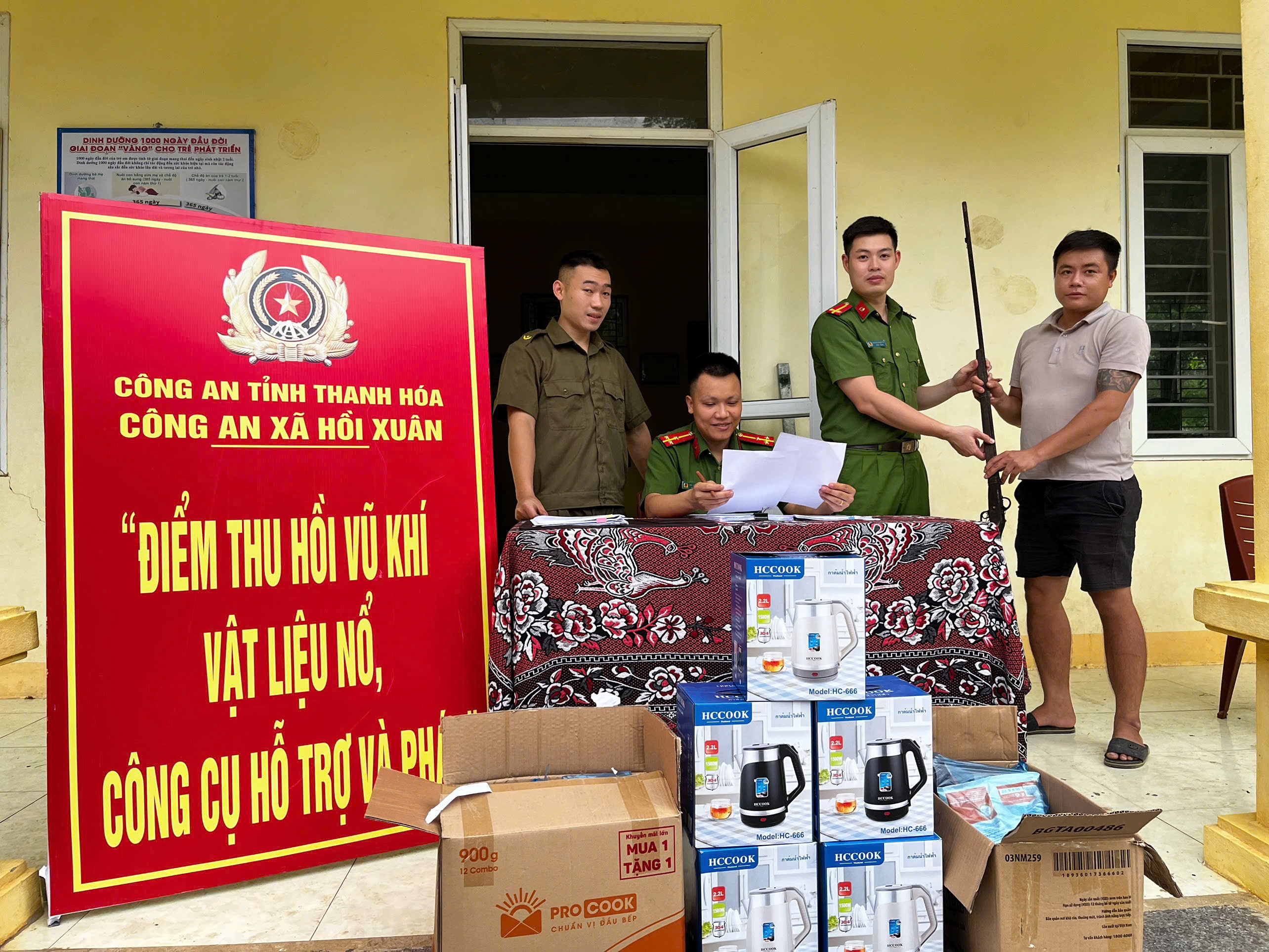 Một trong những cách làm sáng tạo, hiệu quả của Công an xã Hồi Xuân trong công tác vận động Nhân dân giao nộp vũ khí, vật liệu nổ, công cụ hỗ trợ, đó là Chương trình “Đổi quà lấy vũ khí, vật liệu nổ, công cụ hỗ trợ”. Để duy trì thường xuyên Chương trình này, Công an xã đã phối hợp và kêu gọi các cơ quan, đơn vị, doanh nghiệp tham gia hỗ trợ các phần quà, vật dụng thiết yếu, như: Mũ bảo hiểm, ấm đun nước, nồi cơm điện, quạt điện, gạo, nước mắm, dầu ăn…. để trao tặng, động viên cho những người dân tự giác đến giao nộp vũ khí, công cụ hỗ trợ. Các phần quà tuy không lớn về giá trị vật chất, nhưng chứa đựng ý nghĩa khích lệ tinh thần, động viên bà con tích cực tham gia chương trình, góp phần lan toả thông điệp xây dựng một môi trường sống an toàn, bình yên tại địa phương.