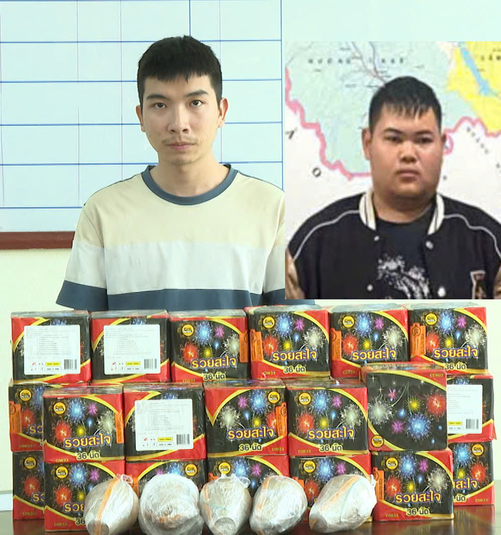 Đối tượng Nguyễn Văn Hai (trái) và Đỗ Minh Trí cùng số pháo thu giữ