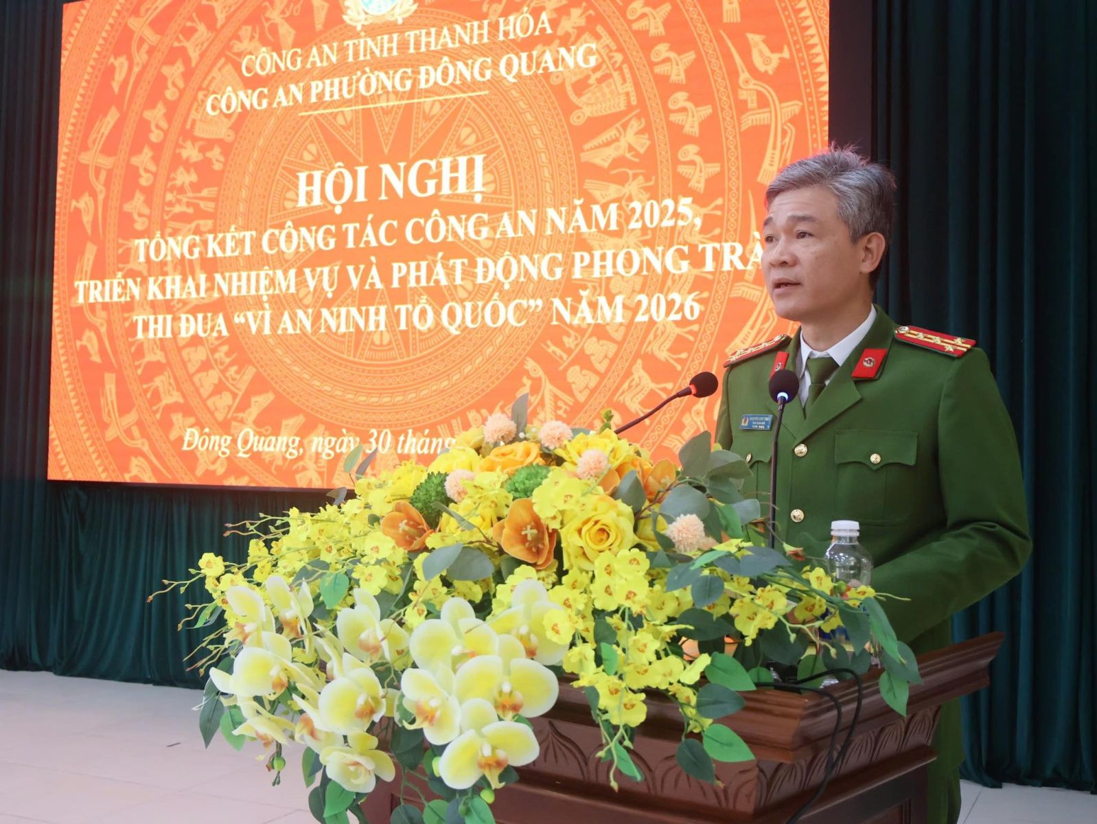 Sáng 30/12/2025, Công an phường Đông Quang tổ chức Hội nghị tổng kết công tác năm 2025, triển khai nhiệm vụ và phát động phong trào thi đua “Vì An ninh Tổ quốc” năm 2026. Đại tá Nguyễn Anh Tuấn, Phó Giám đốc - Thủ trưởng Cơ quan Cảnh sát điều tra Công an tỉnh dự và chỉ đạo Hội nghị.