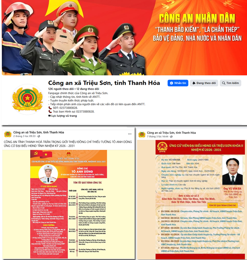 Tại xã Triệu Sơn, fanpage “Công an xã Triệu Sơn” cũng phát huy hiệu quả trong việc tuyên truyền, vận động bầu cử. Trung tá Nguyễn Văn Thu, Trưởng Công an xã cho biết, bên cạnh việc niêm yết danh sách ứng cử viên tại các điểm bầu cử theo đúng quy định, đơn vị còn tích cực đăng tải danh sách và lý lịch của các ứng cử viên đại biểu HĐND xã lên fanpage để cử tri tiện theo dõi. Nhờ đó, người dân có thể tiếp cận thông tin một cách nhanh chóng, thuận tiện và chủ động hơn trong việc tìm hiểu về các ứng cử viên.