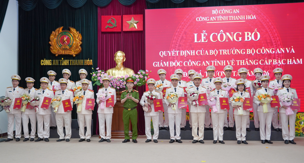 Thực hiện Thông tư số 24/TT-BCA của Bộ trưởng Bộ Công an quy định cấp bậc hàm cao nhất là cấp tá trở xuống đối với sĩ quan, hạ sĩ quan Công an nhân dân theo chức vụ, chức danh và trình độ đào tạo, qua rà soát Công an tỉnh Thanh Hóa có 19 đồng chí Trưởng phòng và tương đương đủ điều kiện được thăng cấp bậc hàm Đại tá; 74 đồng chí Đội trưởng và Trưởng Công an cấp xã đủ điều kiện được thăng cấp bậc hàm Thượng tá.