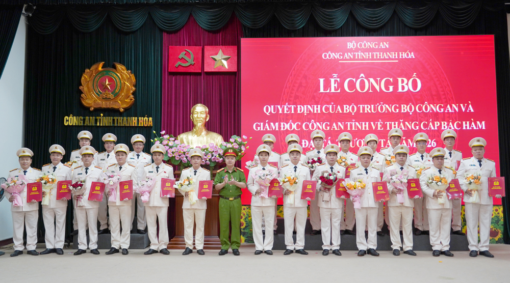 Sáng 29/4/2026, Công an tỉnh Thanh Hóa tổ chức Lễ công bố các Quyết định của Bộ trưởng Bộ Công an và Giám đốc Công an tỉnh về việc thăng cấp bậc hàm Đại tá, Thượng tá năm 2026 cho các đồng chí Trưởng phòng và tương đương, Đội trưởng, Trưởng Công an một số xã, phường. Thiếu tướng Tô Anh Dũng, Ủy viên Ban Thường vụ Tỉnh ủy, Bí thư Đảng ủy, Giám đốc Công an tỉnh dự và chủ trì buổi lễ.