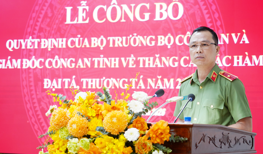 Tại buổi Lễ, thừa ủy quyền của Bộ trưởng Bộ Công an, đồng chí Giám đốc Công an tỉnh đã trao Quyết định thăng cấp bậc hàm từ Thượng tá lên Đại tá đối với 19 đồng chí Trưởng phòng và tương đương; trao Quyết định thăng cấp bậc hàm từ Trung tá lên Thượng tá đối với 74 đồng chí Đội trưởng các đội nghiệp vụ và Trưởng Công an một số xã, phường.