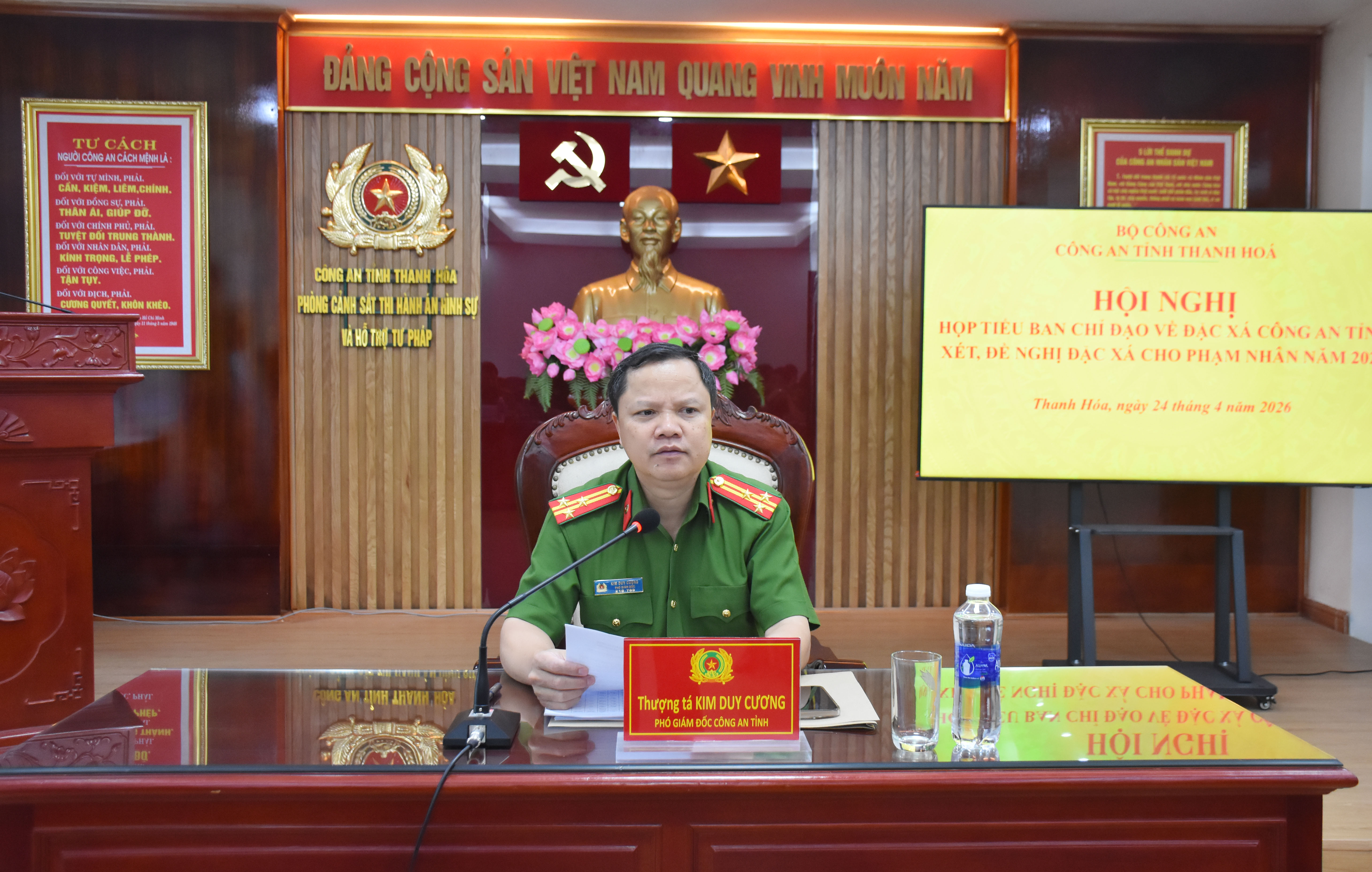 Sáng 24/4/2026, dưới sự chủ trì của đồng chí Thượng tá Kim Duy Cương, Phó Giám đốc Công an tỉnh, Thủ trưởng Cơ quan Thi hành án hình sự và hỗ trợ tư pháp, Tiểu ban Chỉ đạo về đặc xá Công an tỉnh Thanh Hoá đã tổ chức hội nghị xét, đề nghị đặc xá năm 2026 cho các phạm nhân đang chấp hành án tại các cơ sở giam giữ do Công an tỉnh quản lý…