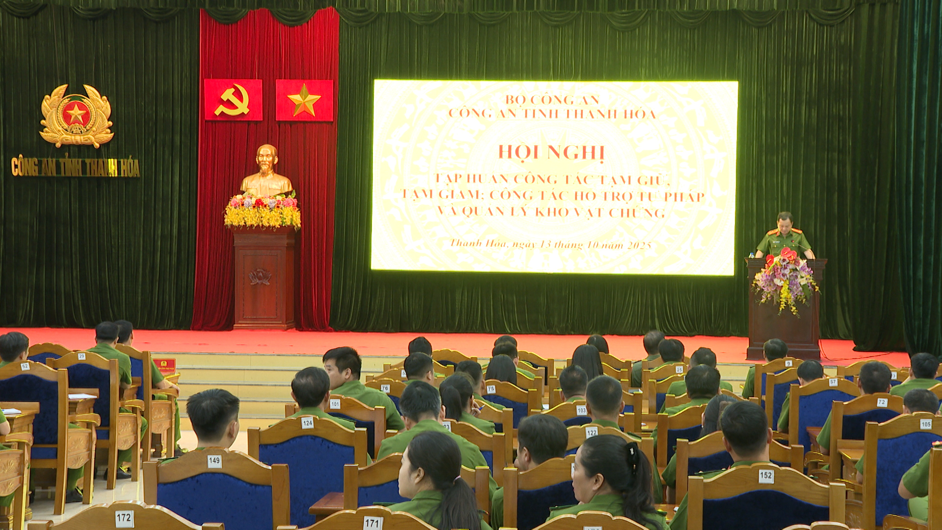 Sáng 13/10/2025, Công an tỉnh tổ chức Hội nghị tập huấn công tác tạm giữ, tạm giam, công tác hỗ trợ tư pháp và quản lý kho vật chứng cho cán bộ, chiến sĩ làm công tác tạm giữ tạm giam, hỗ trợ tư pháp và quản lý kho vật chứng thuộc Phòng Cảnh sát Thi hành án hình sự và hỗ trợ tư pháp, Trại Tạm giam Công an tỉnh. Thượng tá Trần Thái Quang Hoàng, Phó Giám đốc - Thủ trưởng Cơ quan thi hành án hình sự, tạm giữ, tạm giam Công an tỉnh dự và phát biểu chỉ đạo tại Hội nghị...