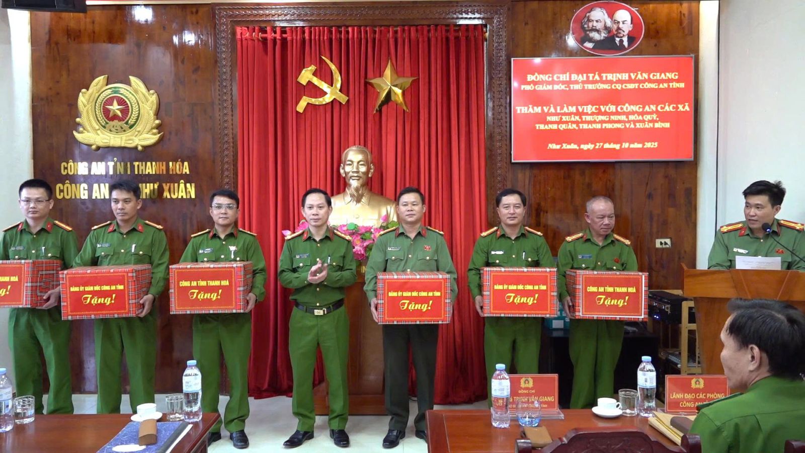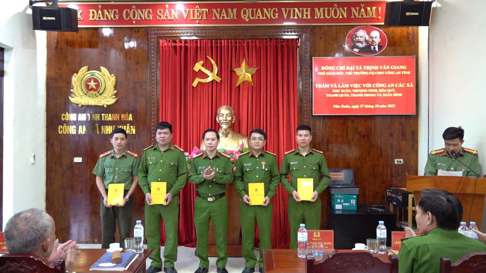 Thực hiện chương trình công tác tháng 10/2025, ngày 27/10/2025, đồng chí Đại tá Trịnh Văn Giang, Phó Giám đốc Công an tỉnh đã đến thăm, làm việc với Công an các xã: Như Xuân, Hóa Quỳ, Thượng Ninh, Xuân Bình, Thanh Quân và Thanh Phong về tình hình, kết quả thực hiện nhiệm vụ bảo đảm an ninh, trật tự (ANTT) trên địa bàn. Tham gia Đoàn công tác có đại diện lãnh đạo một số phòng nghiệp vụ Công an tỉnh.