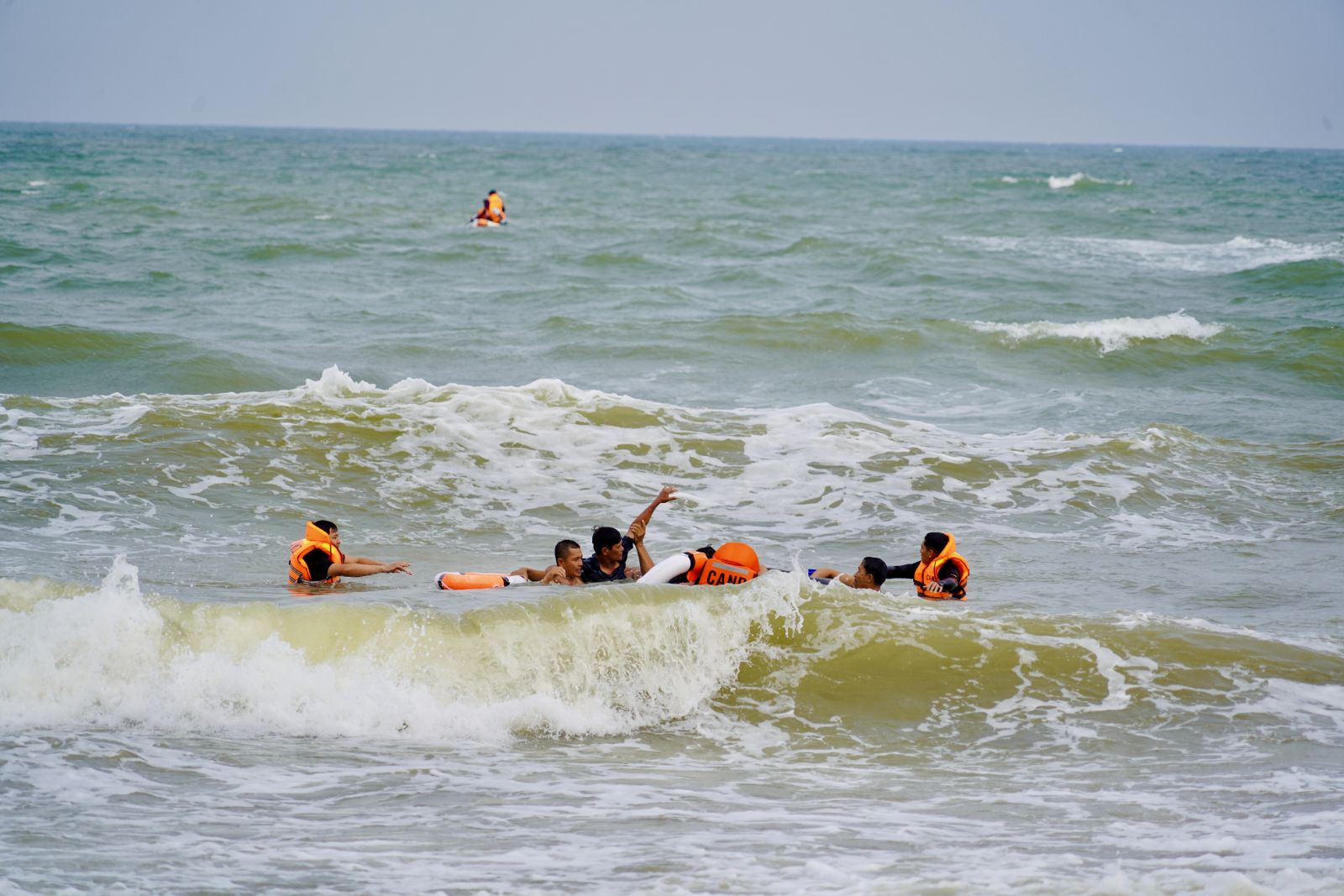 Lực lượng cứu hộ sử dụng phương tiện chuyên dụng tổ chức tìm kiếm, đưa nạn nhân vào bờ an toàn trong điều kiện sóng lớn