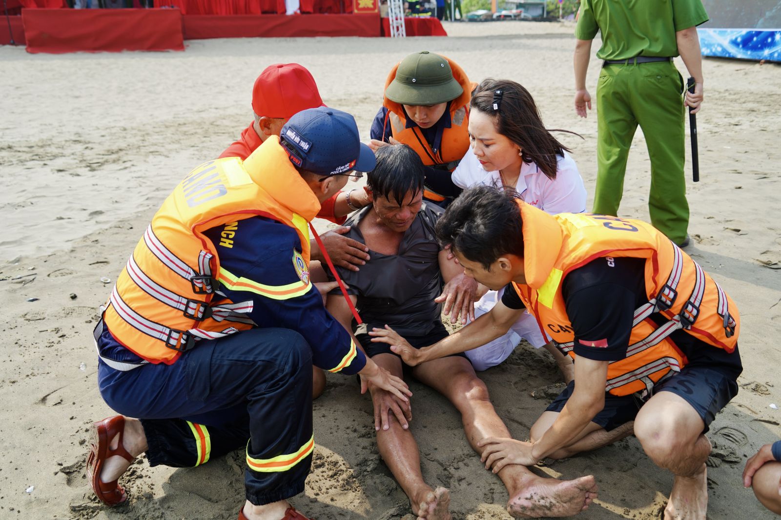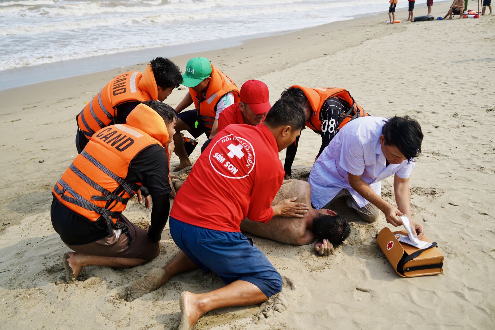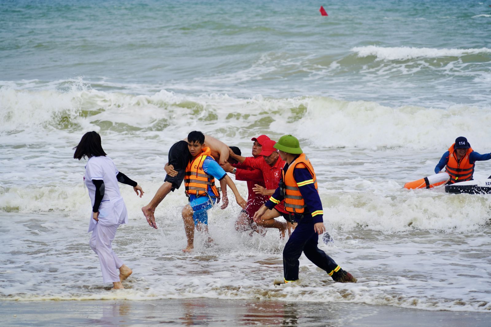 Tình huống 1: Có một gia đình gồm 4 người đang tắm biển. Bất ngờ, sóng lớn đánh mạnh vào phao khiến 3 người bị văng khỏi phao, chới với giữa dòng nước. Người còn lại thấy vậy thì hoảng loạn, mất bình tĩnh, truy hô kêu cứu nhưng bị sóng cuốn ngày càng xa bờ. Ngay khi phát hiện, lực lượng cứu hộ tại chỗ nhanh chóng triển khai tiếp cận bằng phao cứu sinh, đưa nạn nhân vào bờ và tổ chức sơ cấp cứu ban đầu.