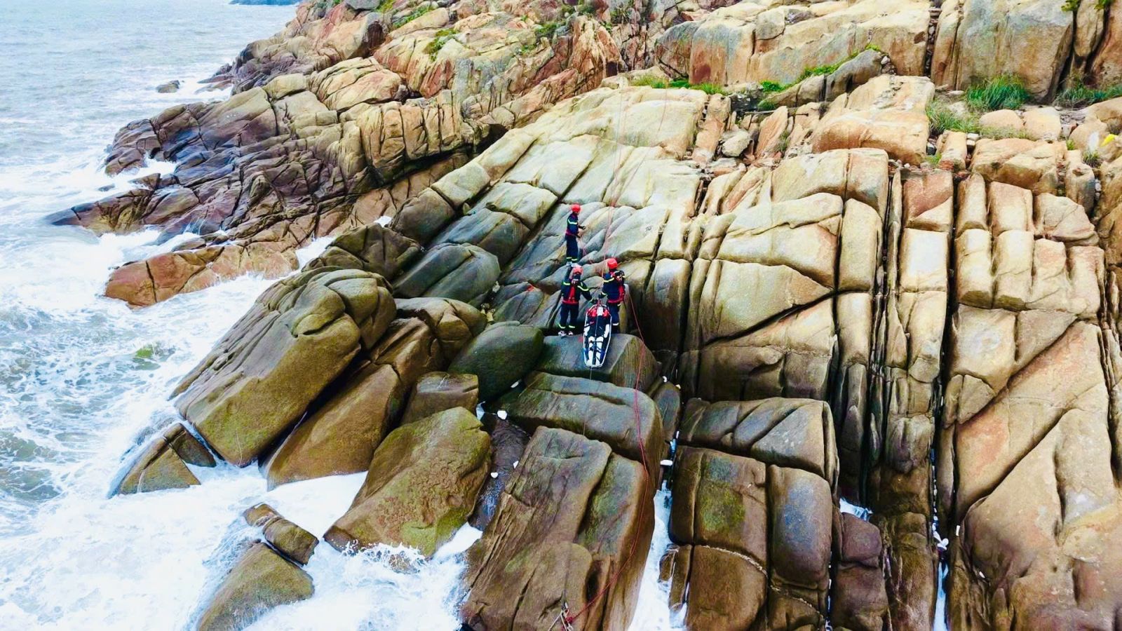Lực lượng chức năng triển khai phương án cứu hộ tại khu vực vách đá núi Trường Lệ, đưa nạn nhân bị tai nạn xuống vị trí an toàn