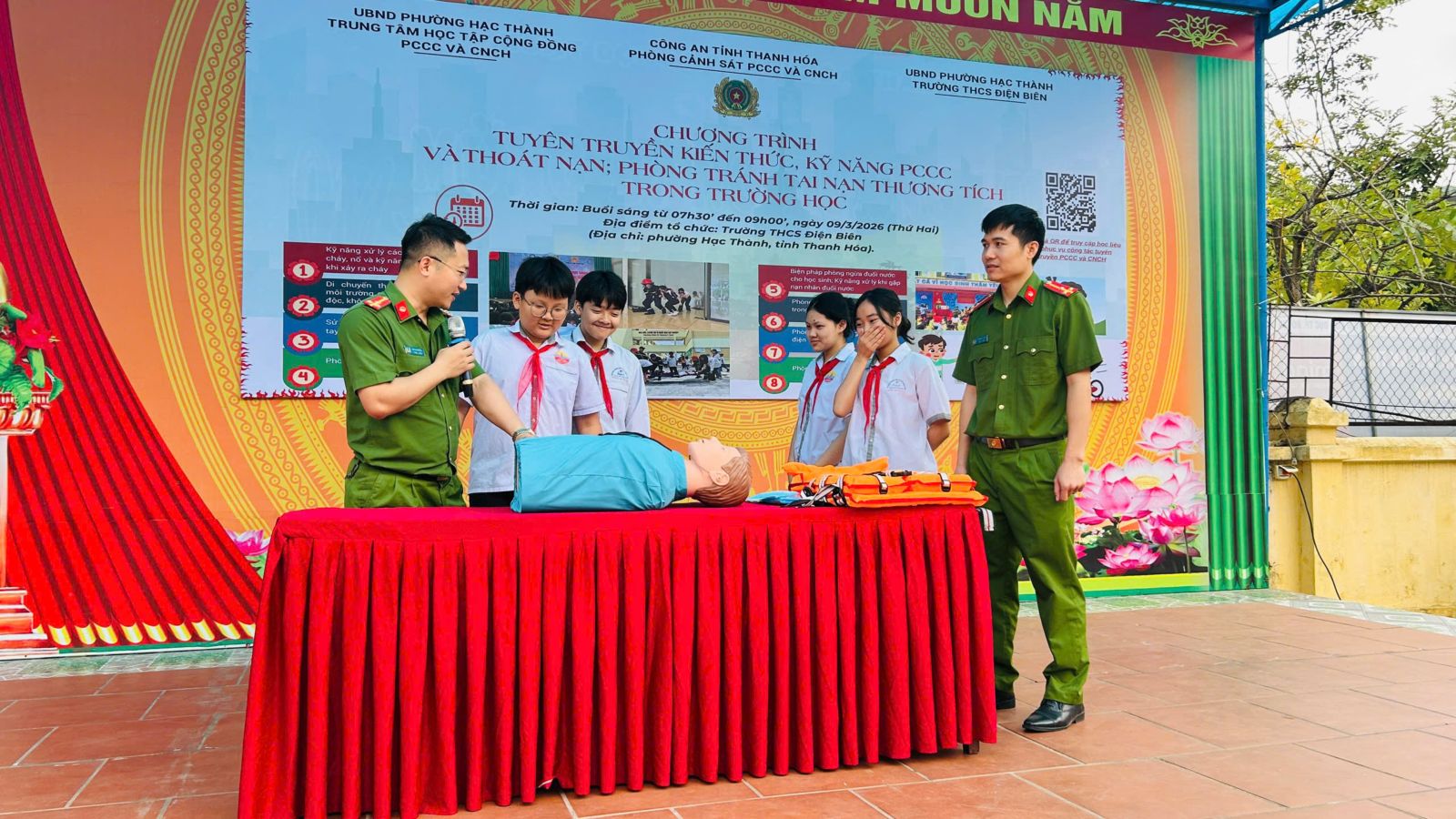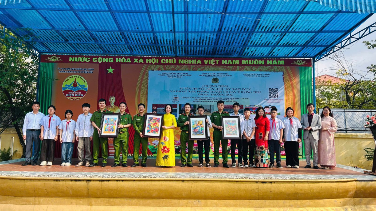 Nhằm nâng cao nhận thức và trang bị kỹ năng phòng cháy, chữa cháy (PCCC), cứu nạn, cứu hộ (CNCH) cho học sinh, đồng thời đổi mới hình thức tuyên truyền theo hướng trực quan, sinh động, gắn lý thuyết với trải nghiệm thực tế, sáng 09/3/2026, Phòng Cảnh sát PCCC và CNCH Công an tỉnh Thanh Hóa phối hợp với Ban Giám hiệu Trường THCS Điện Biên tổ chức chương trình tuyên truyền, trải nghiệm “Làm lính cứu hỏa nhí”, kết hợp cuộc thi vẽ tranh về người lính cứu hỏa cho hơn 1.600 cán bộ, giáo viên và học sinh nhà trường…