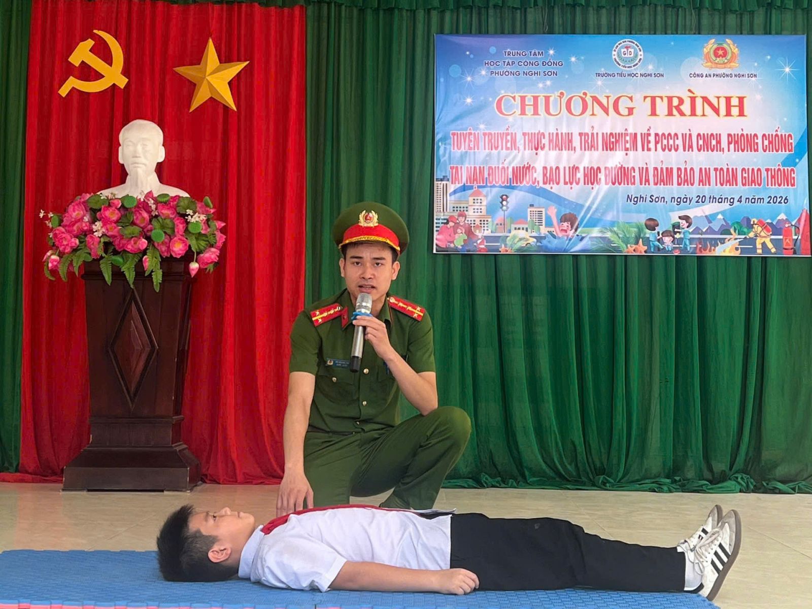 Sáng 20/4/2026, Công an phường Nghi Sơn phối hợp với Trung tâm Học tập cộng đồng phường Nghi Sơn tổ chức chương trình tuyên truyền, phổ biến pháp luật, kết hợp thực hành, trải nghiệm về phòng cháy, chữa cháy và cứu nạn, cứu hộ (PCCC và CNCH), phòng, chống tai nạn đuối nước, bạo lực học đường cho cán bộ, giáo viên, phụ huynh và học sinh Trường Tiểu học Nghi Sơn