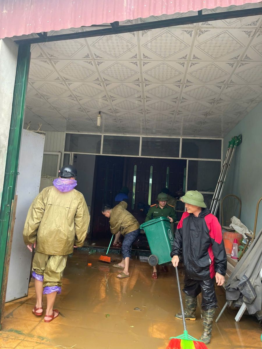 Công an xã Cổ Lũng tham gia hỗ trợ gia đình ông Lương Viết Nghiêm, thôn Phìa dọn nhà sau lũ.