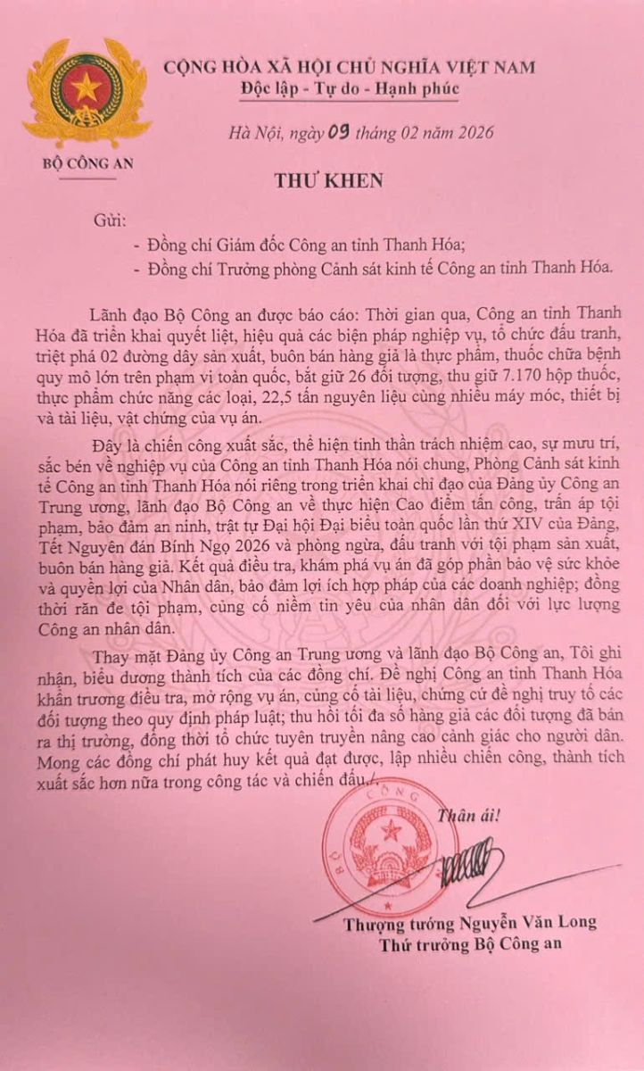 Ngày 09/2/2026, thay mặt Đảng ủy Công an Trung ương và lãnh đạo Bộ Công an, Thượng tướng Nguyễn Văn Long, Thứ trưởng Bộ Công an đã gửi Thư khen Công an tỉnh Thanh Hóa về thành tích xuất sắc trong đấu tranh, triệt phá các đường dây tội phạm sản xuất, buôn bán hàng giả là thực phẩm, thuốc chữa bệnh quy mô lớn trên phạm vi toàn quốc.