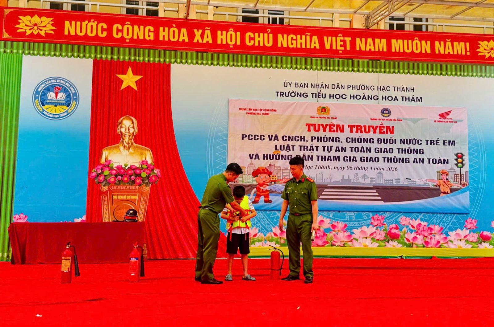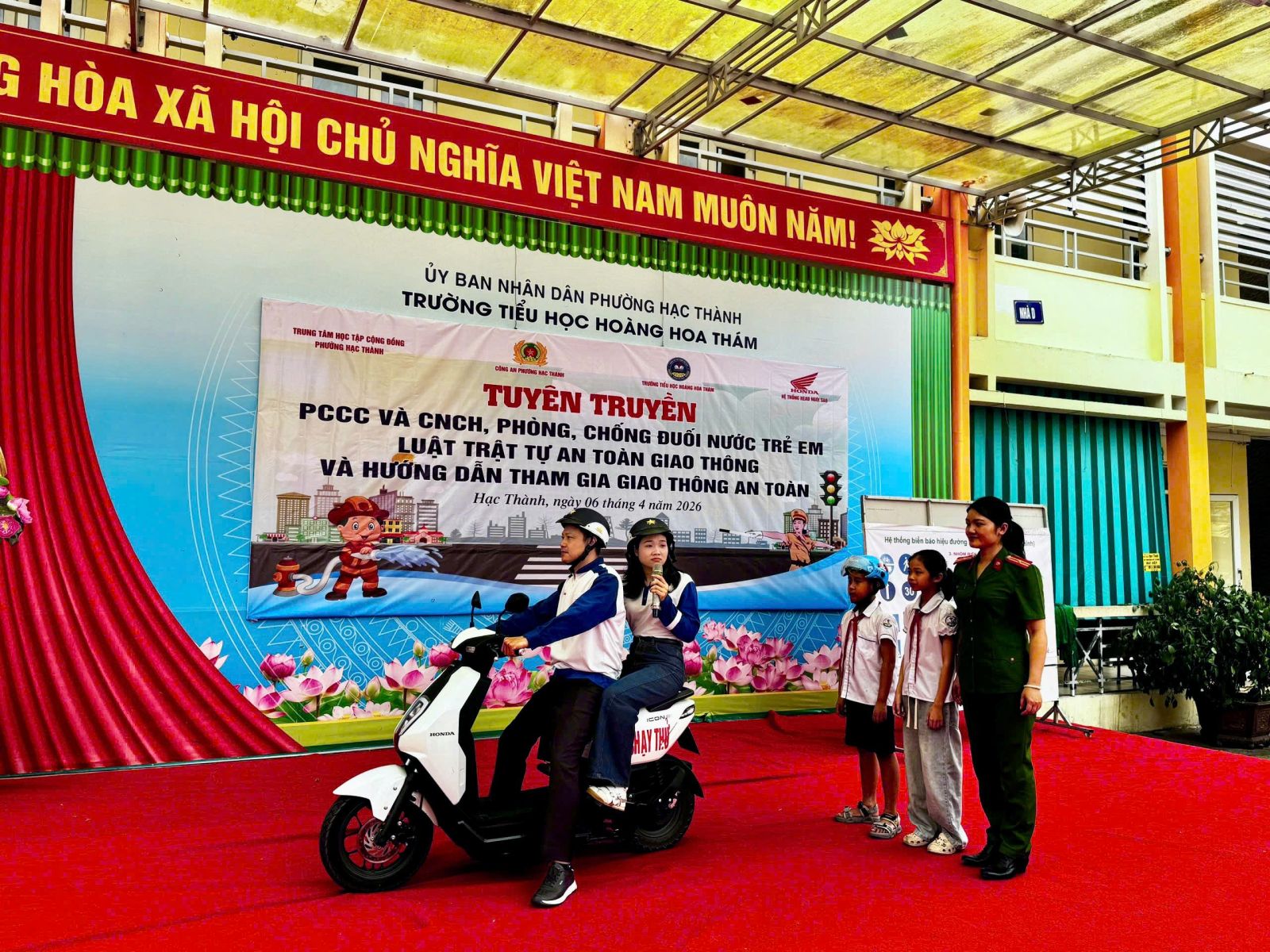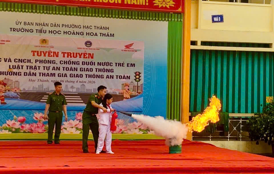 Sáng 06/4/2026, trong khuôn khổ chuỗi hoạt động của Trung tâm học tập cộng đồng phường Hạc Thành, Công an phường Hạc Thành đã phối hợp với Trường Tiểu học Hoàng Hoa Thám tổ chức buổi tuyên truyền, phổ biến kiến thức về phòng cháy, chữa cháy (PCCC) và cứu nạn, cứu hộ (CNCH); phòng, chống tai nạn đuối nước trẻ em; pháp luật về trật tự an toàn giao thông và kỹ năng tham gia giao thông an toàn cho học sinh.