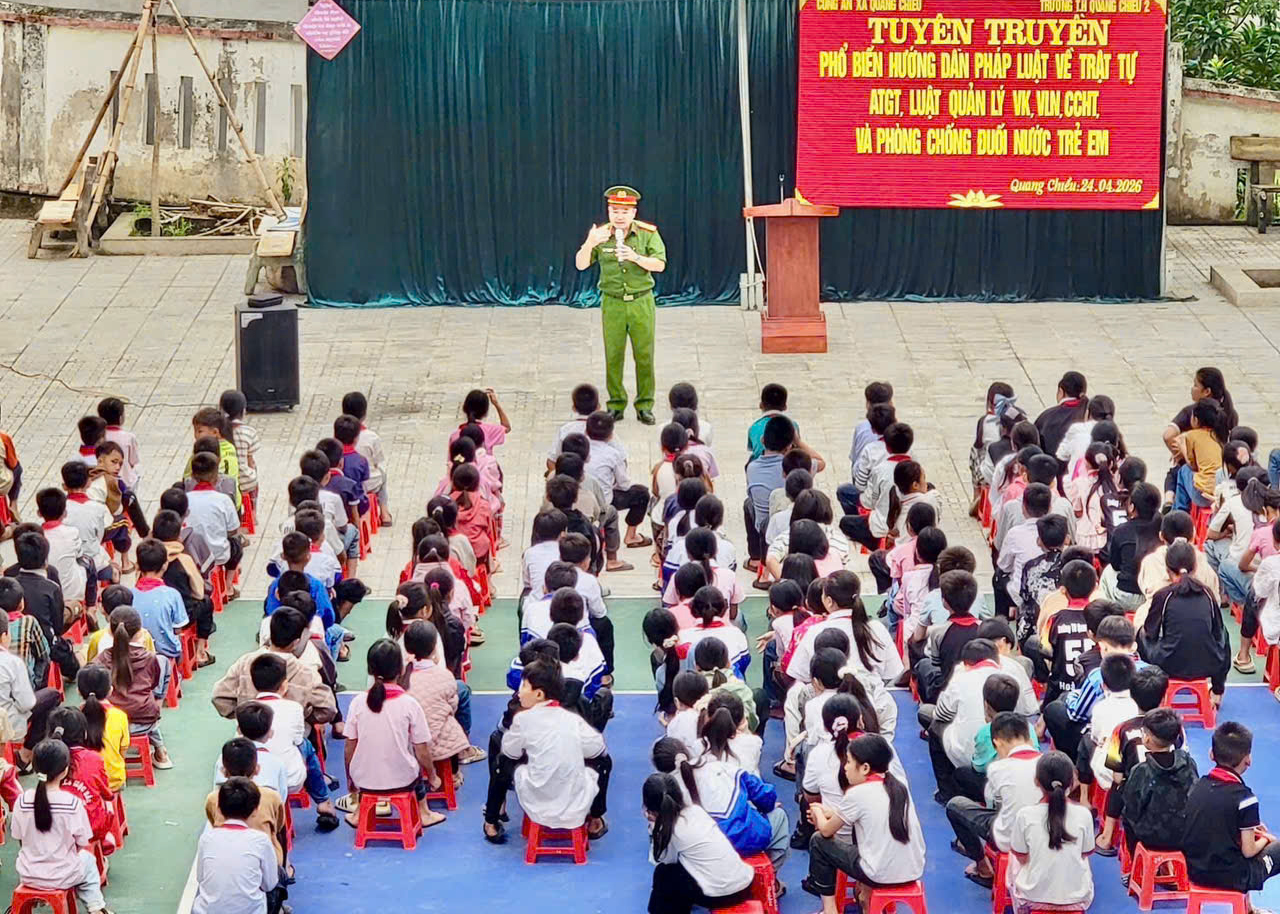 Nhằm nâng cao nhận thức, ý thức chấp hành pháp luật cho học sinh và cán bộ, giáo viên, sáng 24/4, Công an xã Quang Chiểu đã tổ chức buổi tuyên truyền, phổ biến pháp luật về trật tự, an toàn giao thông; Luật Quản lý, sử dụng vũ khí, vật liệu nổ, công cụ hỗ trợ và kỹ năng phòng, chống đuối nước cho 374 học sinh, giáo viên Trường THCS Quang Chiểu 2…