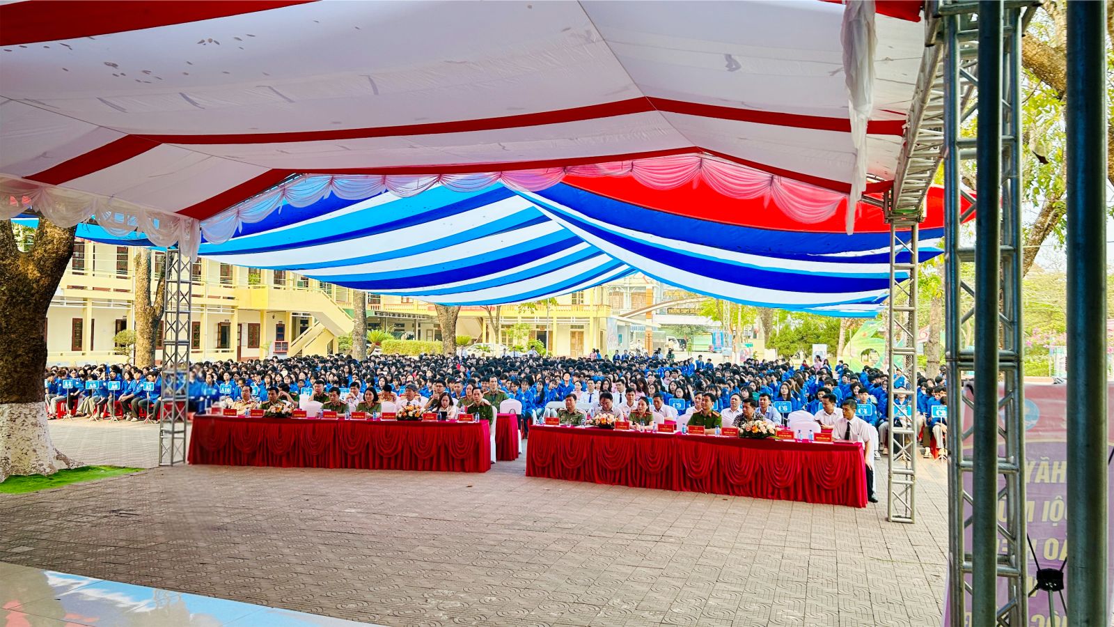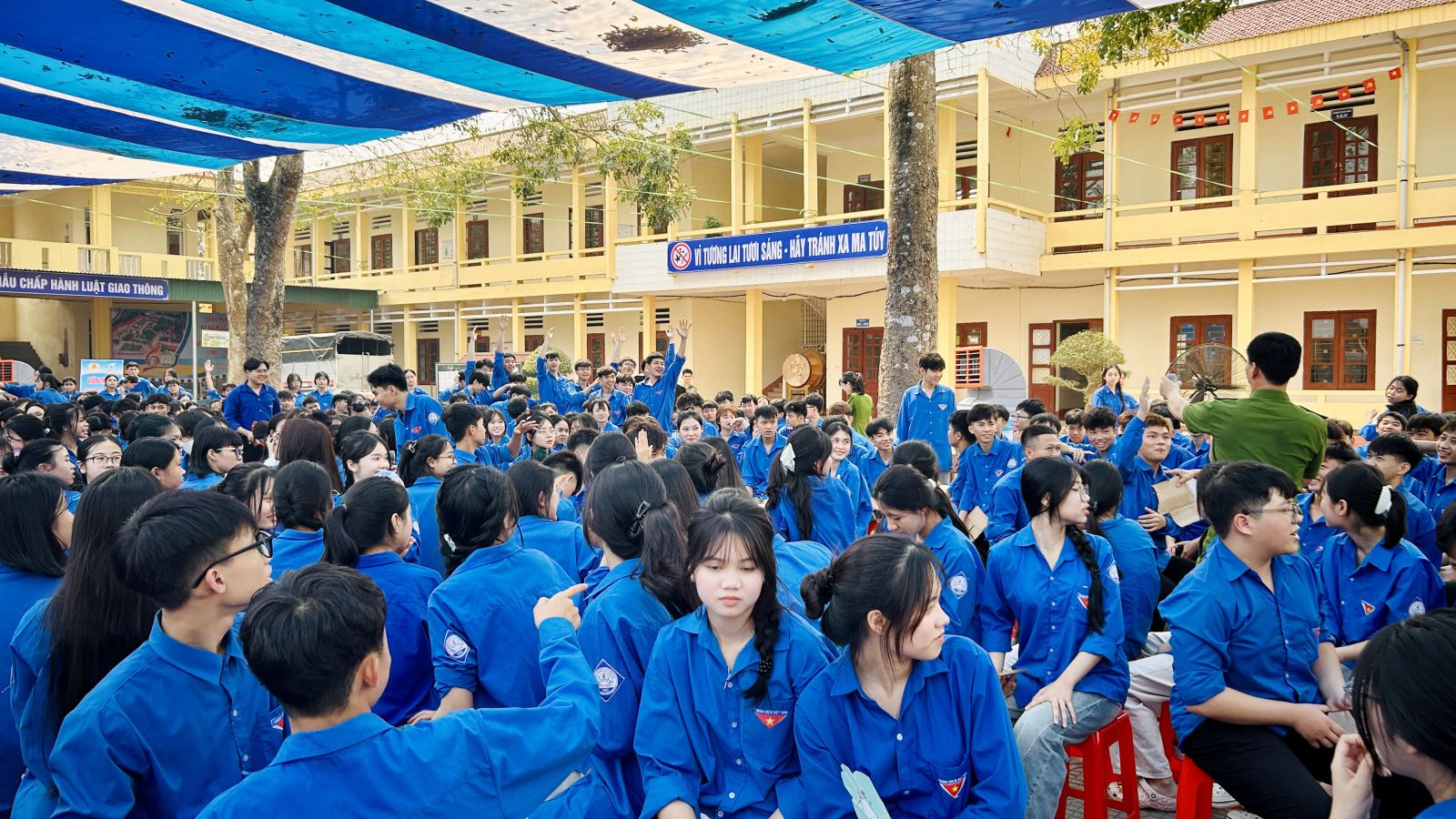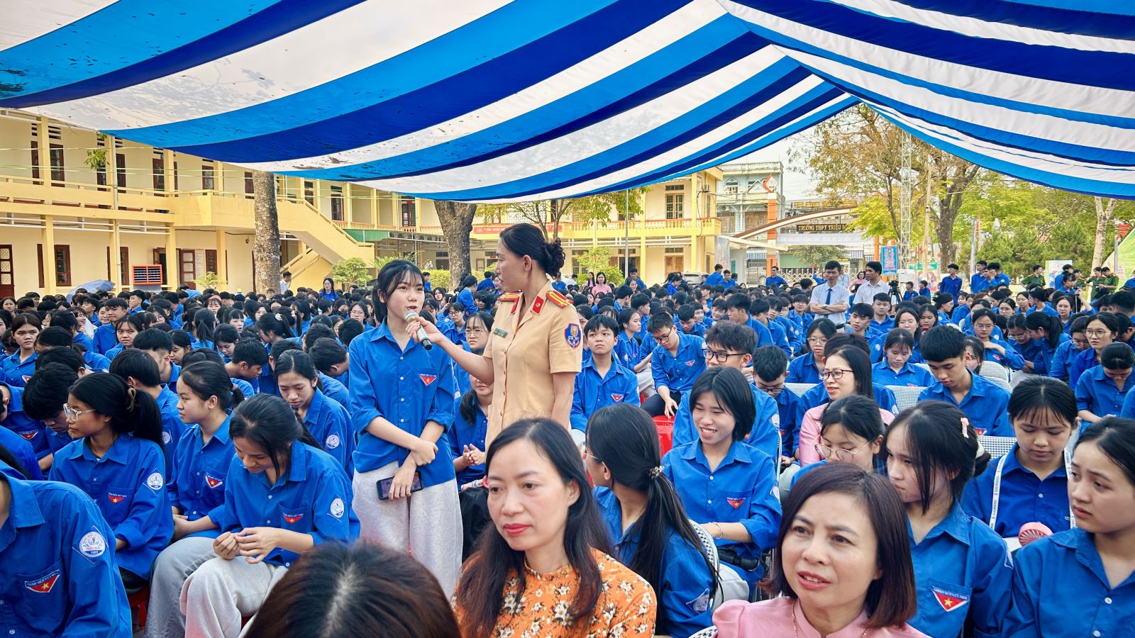 Toàn cảnh hội nghị tuyên truyền pháp luật, trang bị kỹ năng phòng, chống tội phạm, bảo đảm an toàn giao thông cho toàn thể cán bộ, giáo viên và hơn 1.300 học sinh trường THPT Triệu Sơn 1