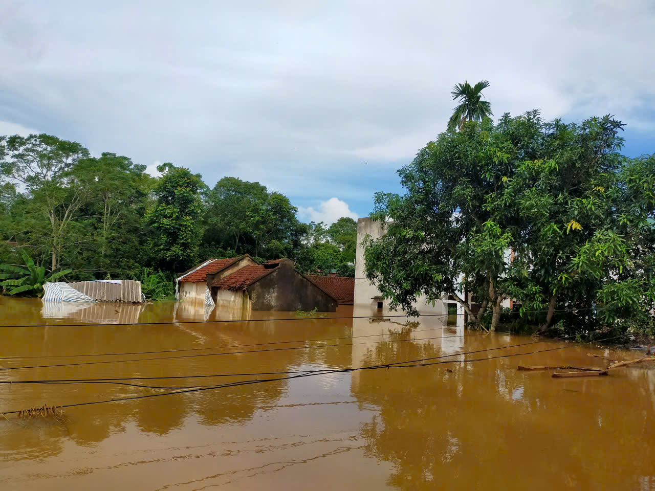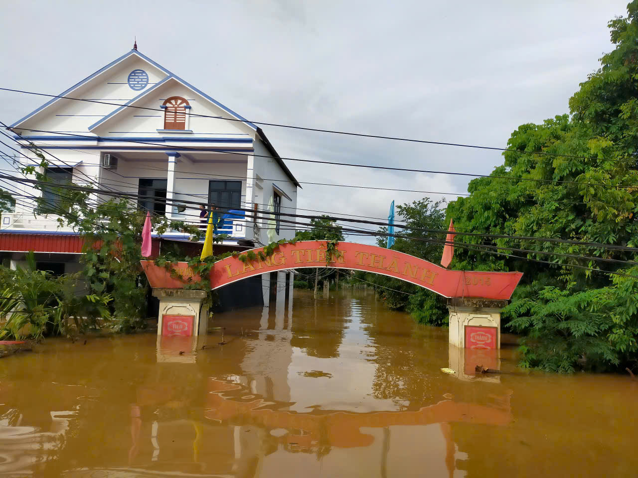 Cổng làng Tiến Thành, xã Kim Tân và các hộ gia đình bị ngập sâu trong nước