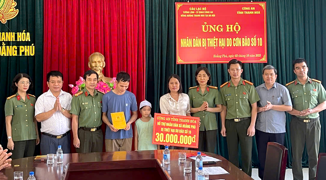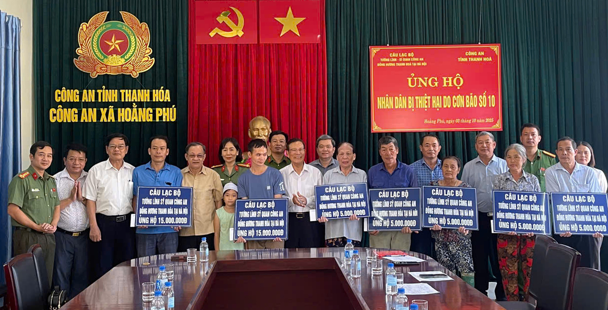 Đồng hành và sẻ chia những khó khăn, mất mát của Nhân dân, sáng 03/10/2025, Đoàn công tác của Câu lạc bộ Tướng lĩnh, sĩ quan Công an đồng hương Thanh Hoá tại Hà Nội do đồng chí Thiếu tướng Trịnh Xuân Thu, nguyên Giám đốc Công an tỉnh Thanh Hóa, Chủ nhiệm Câu lạc bộ làm Trưởng đoàn đã phối hợp cùng Công an tỉnh Thanh Hoá, cấp uỷ, chính quyền xã Hoằng Phú tổ chức thăm hỏi, động viên và tặng quà hỗ trợ các gia đình có người chết và bị thiệt hại nặng do bão số 10 gây ra.