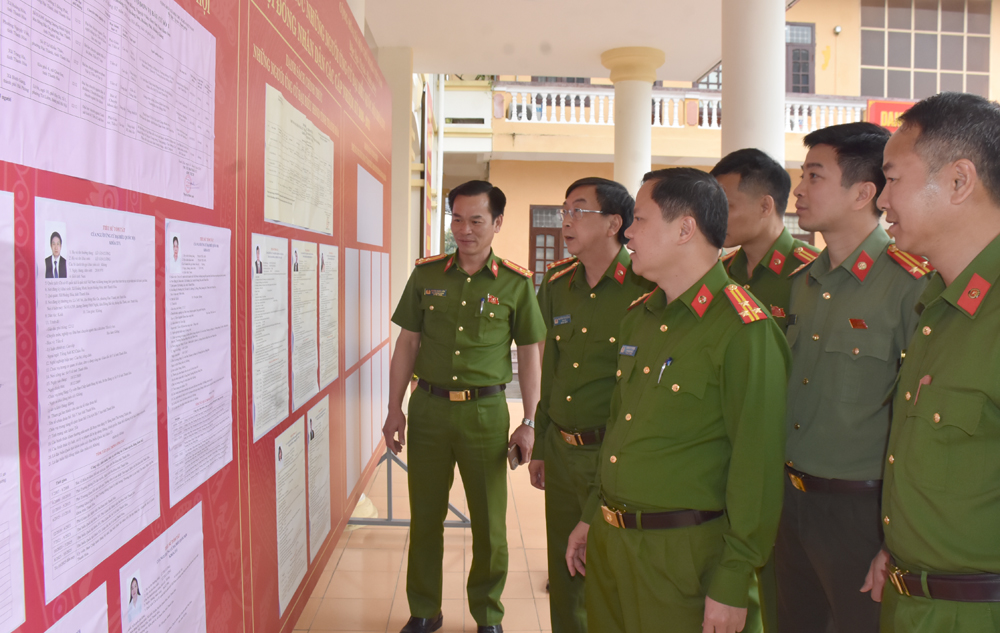 Tại Trại tạm giam Công an tỉnh, Đoàn công tác đã trực tiếp khảo sát các khu vực bỏ phiếu, kiểm tra việc niêm yết danh sách cử tri, công tác tuyên truyền, trang trí khánh tiết, chuẩn bị cơ sở vật chất, phương án đảm bảo an ninh trật tự, phòng cháy, chữa cháy tại các điểm bầu cử; đồng thời kiểm tra công tác phối hợp của các cơ sở với UBND cấp xã về việc lập, niêm yết danh sách cử tri; công tác chuẩn bị đảm bảo an toàn phục vụ công tác bầu cử; xây dựng kế hoạch phân công, bố trí lực lượng, phương tiện đảm bảo công tác an ninh trật tự đối với khu vực bầu cử…
