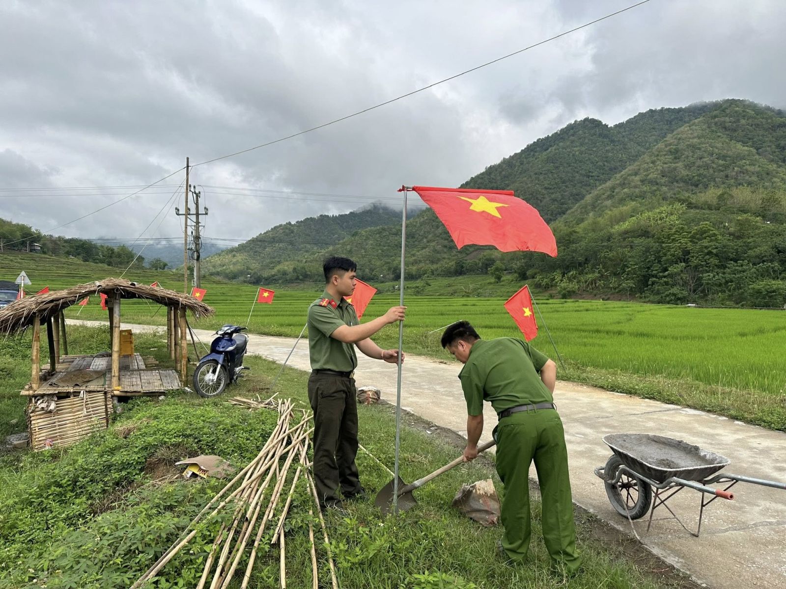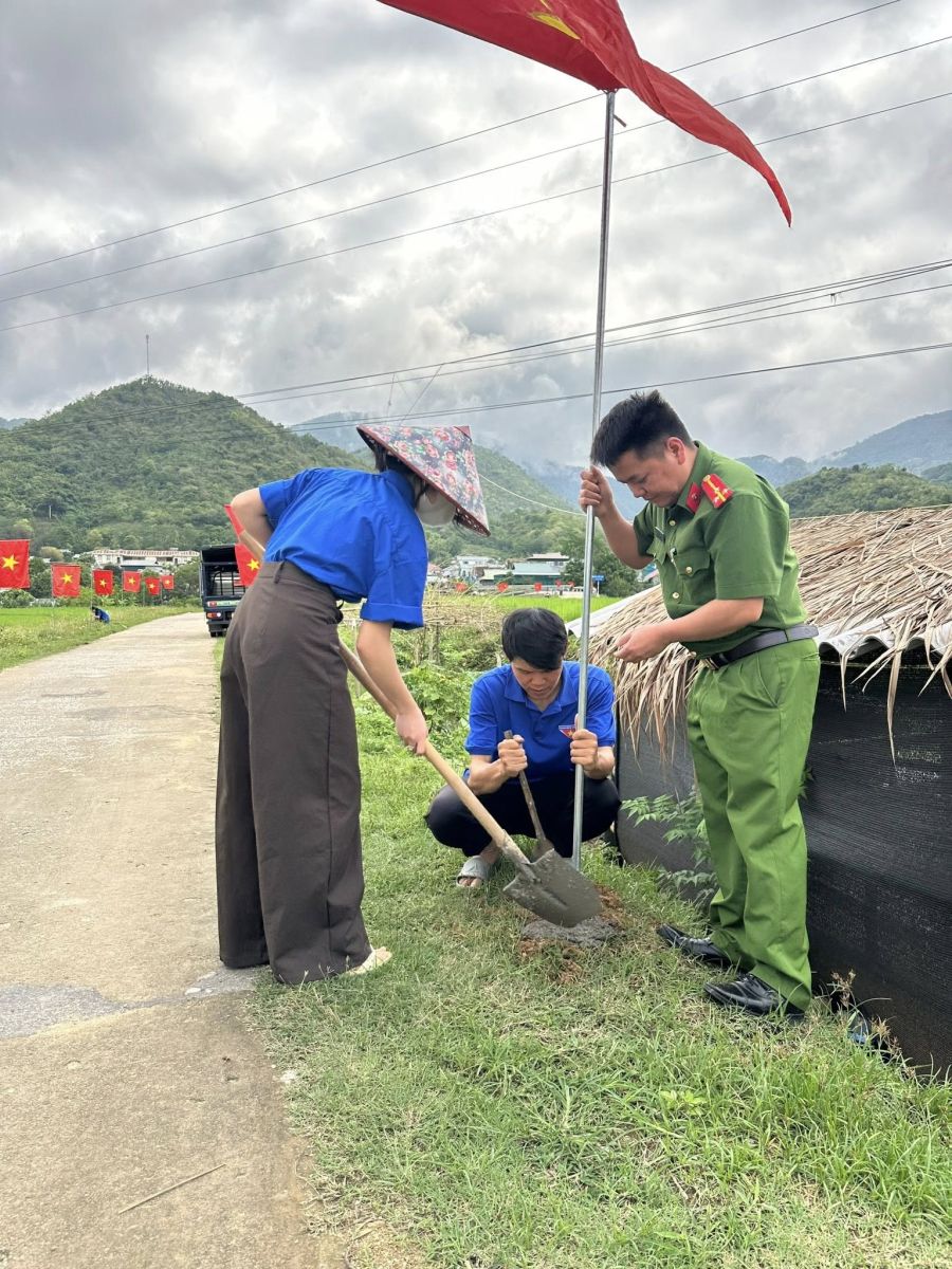Đoàn viên thanh niên Công an xã Quang Chiểu cùng lực lượng Đoàn xã, Chi đoàn bản Pùng tham gia dựng cột, treo cờ trên tuyến “Đường cờ Tổ quốc”.