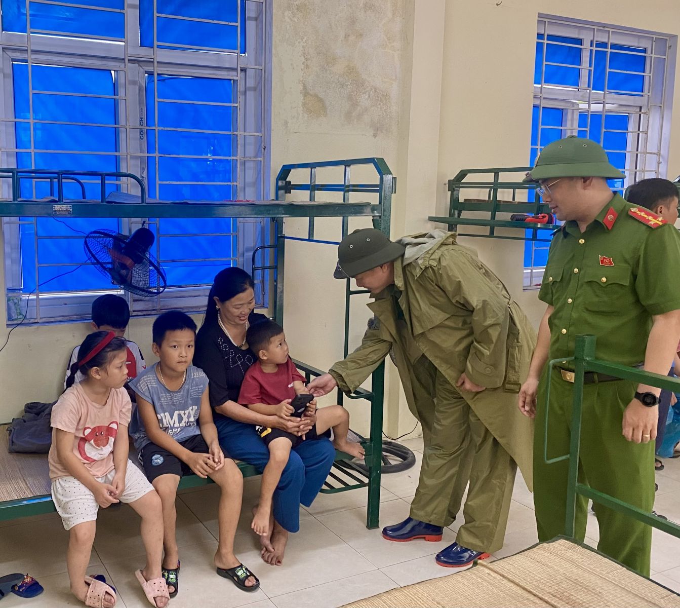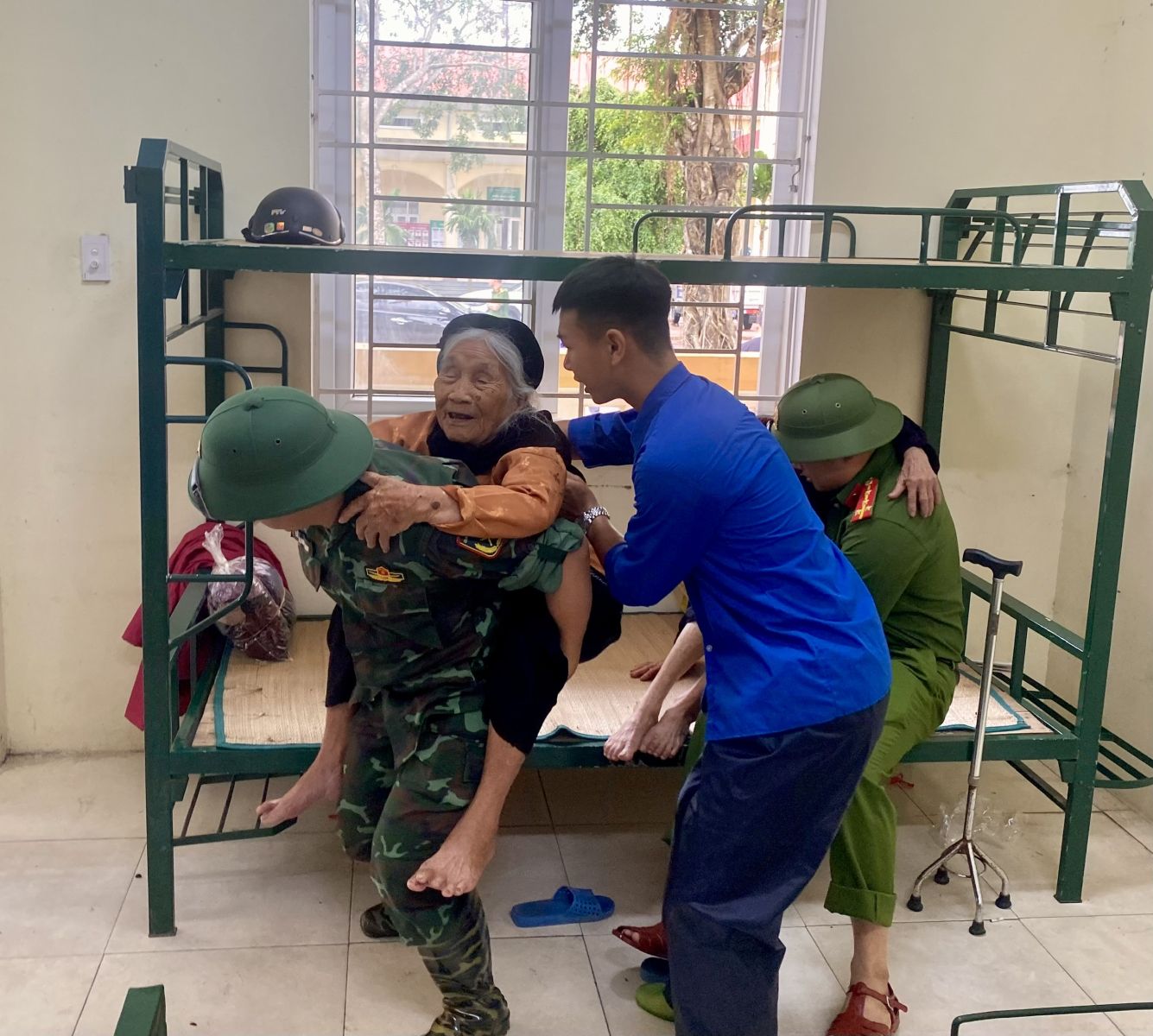 Lực lượng Công an phường phối hợp cùng Ban Chỉ huy quân sự và các đoàn thể sơ tán người già, trẻ em đến nơi tránh trú bão tập trung.