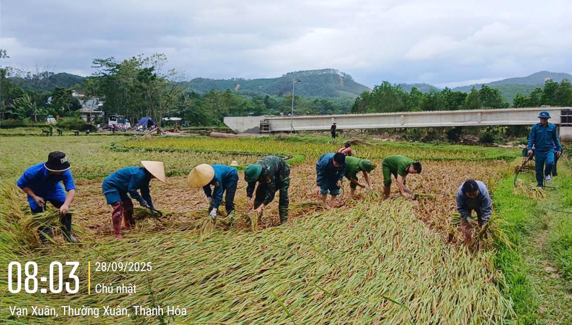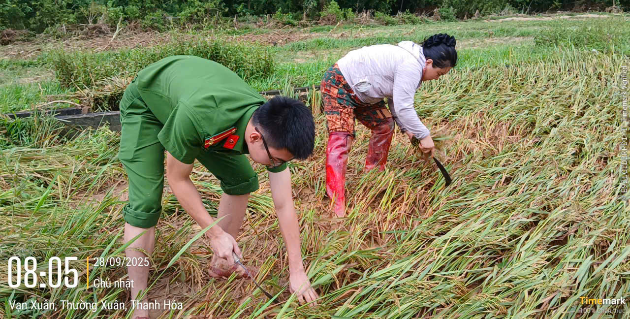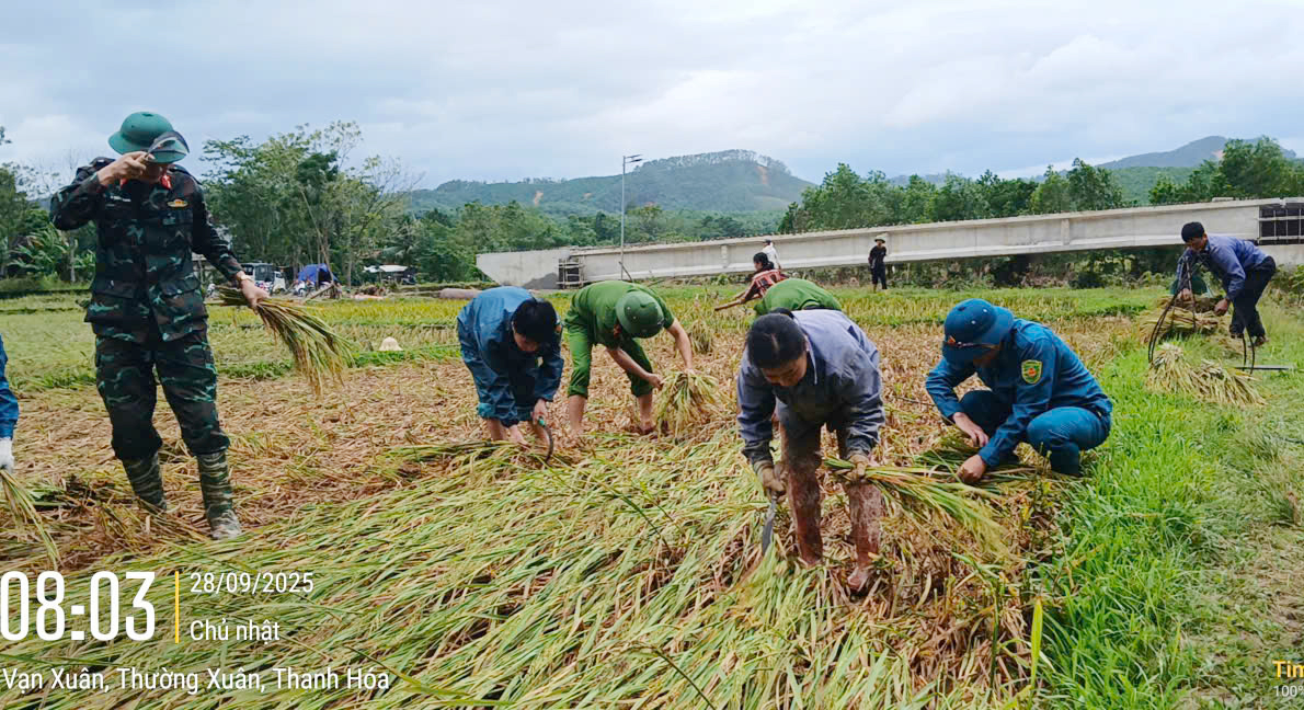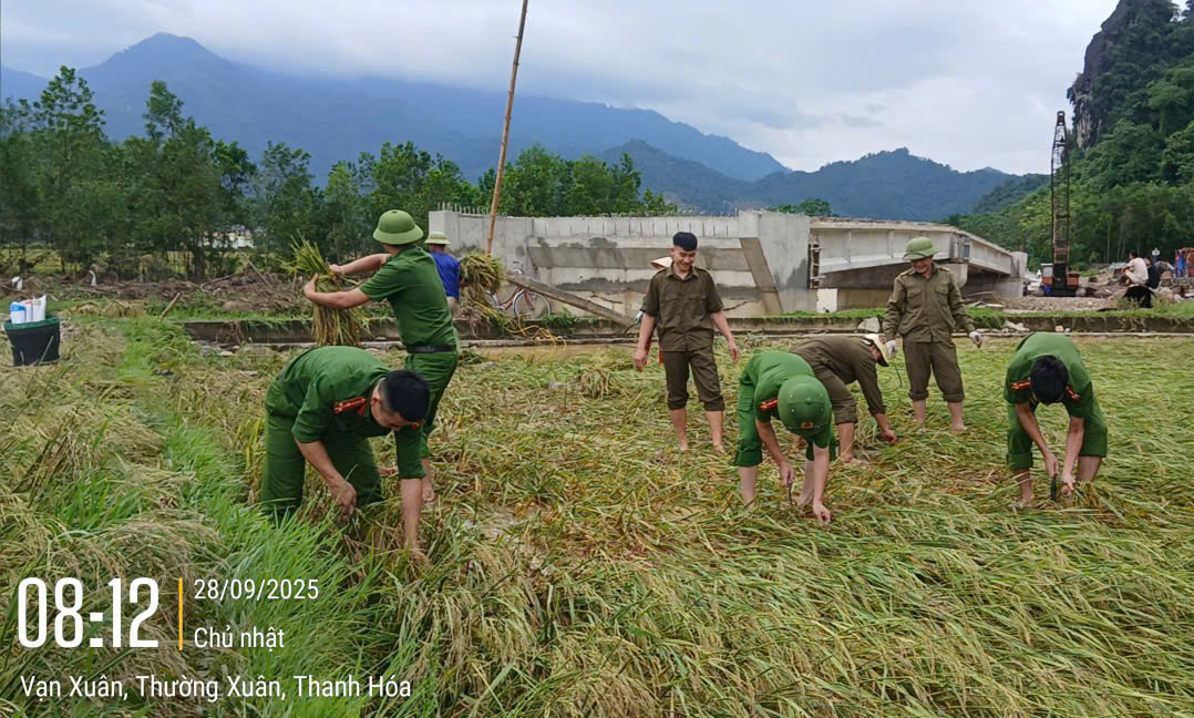 Với phương châm “Xanh nhà hơn già đồng”, gần 6h sáng Chủ Nhật ngày 28/9/2025, gần 50 cán bộ, chiến sĩ Công an xã Vạn Xuân và Tổ bảo vệ an ninh, trật tự ở cơ sở đã cùng các lực lượng quân sự, thanh niên, phụ nữ xã khẩn trương xuống đồng chạy đua với thời gian để gặt lúa giúp bà con nhân dân thôn Ná Mén thu hoạch kịp thời, bảo vệ thành quả lao động trước những tác động của thiên tai.