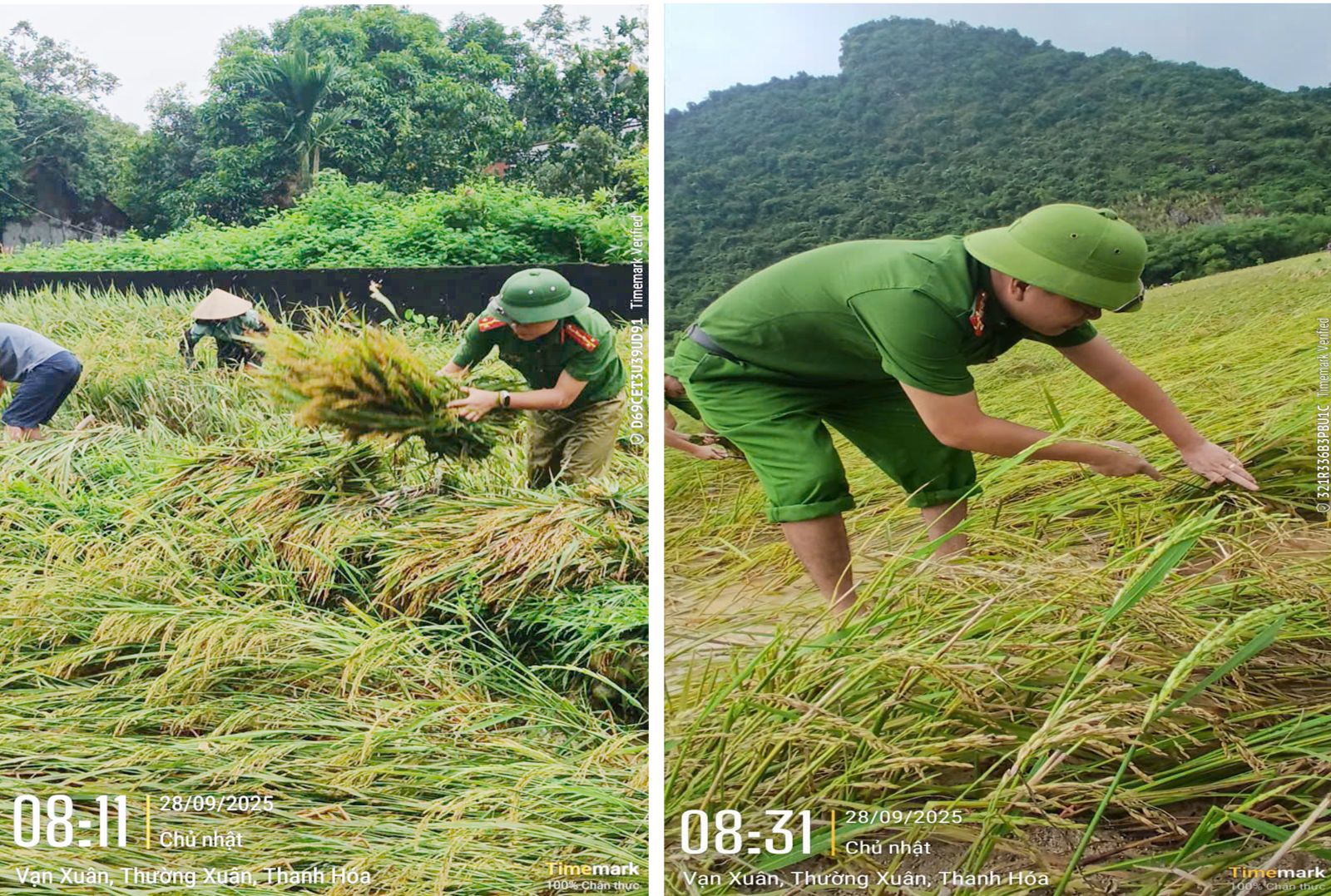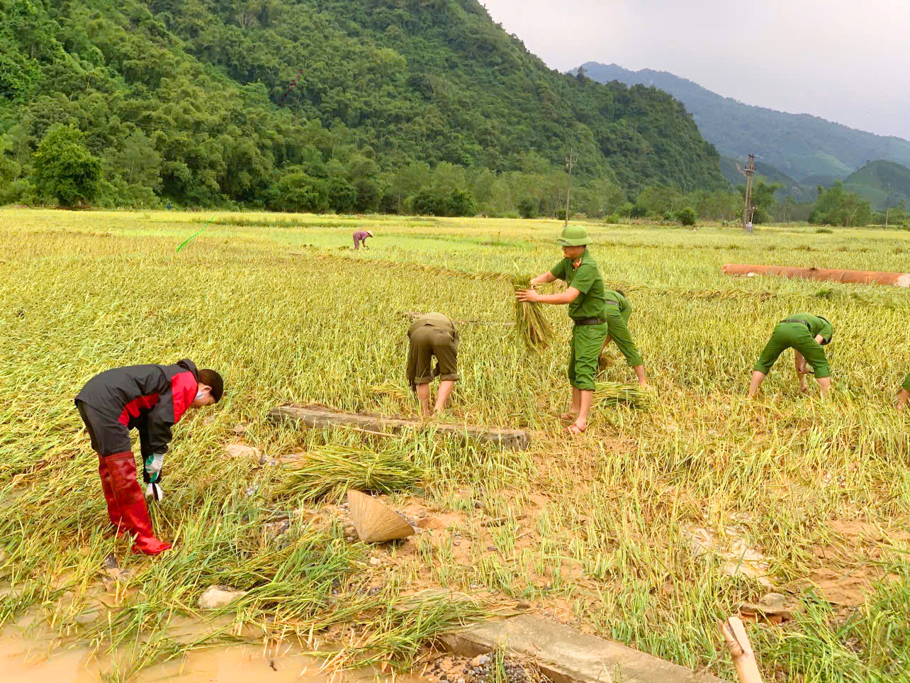 Công an xã Vạn Xuân gặt lúa giúp dân trước khi bão số 10 đổ bộ