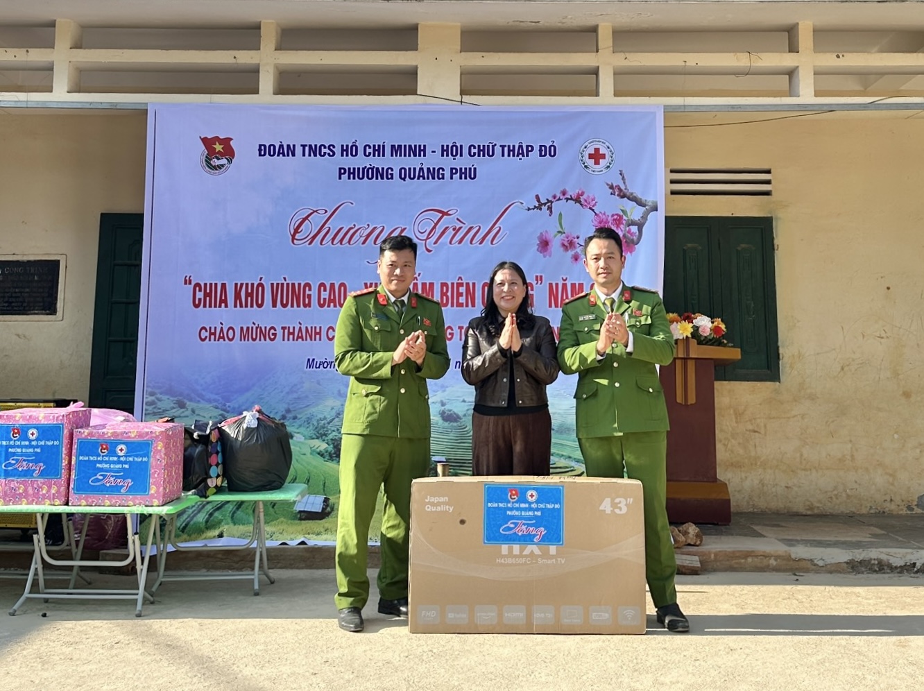 Tham gia cùng chương trình, Chi đoàn Thanh niên Công an phường Quảng Phú trao tặng 02 chiếc ti vi cho 2 nhà trường. Đây là những phần quà thiết thực, góp phần hỗ trợ nhà trường từng bước cải thiện điều kiện cơ sở vật chất, phục vụ hiệu quả công tác giảng dạy và học tập của giáo viên, học sinh trên địa bàn vùng cao còn nhiều khó khăn, thể hiện tinh thần trách nhiệm, sẻ chia và nghĩa tình đối với Nhân dân vùng biên giới.