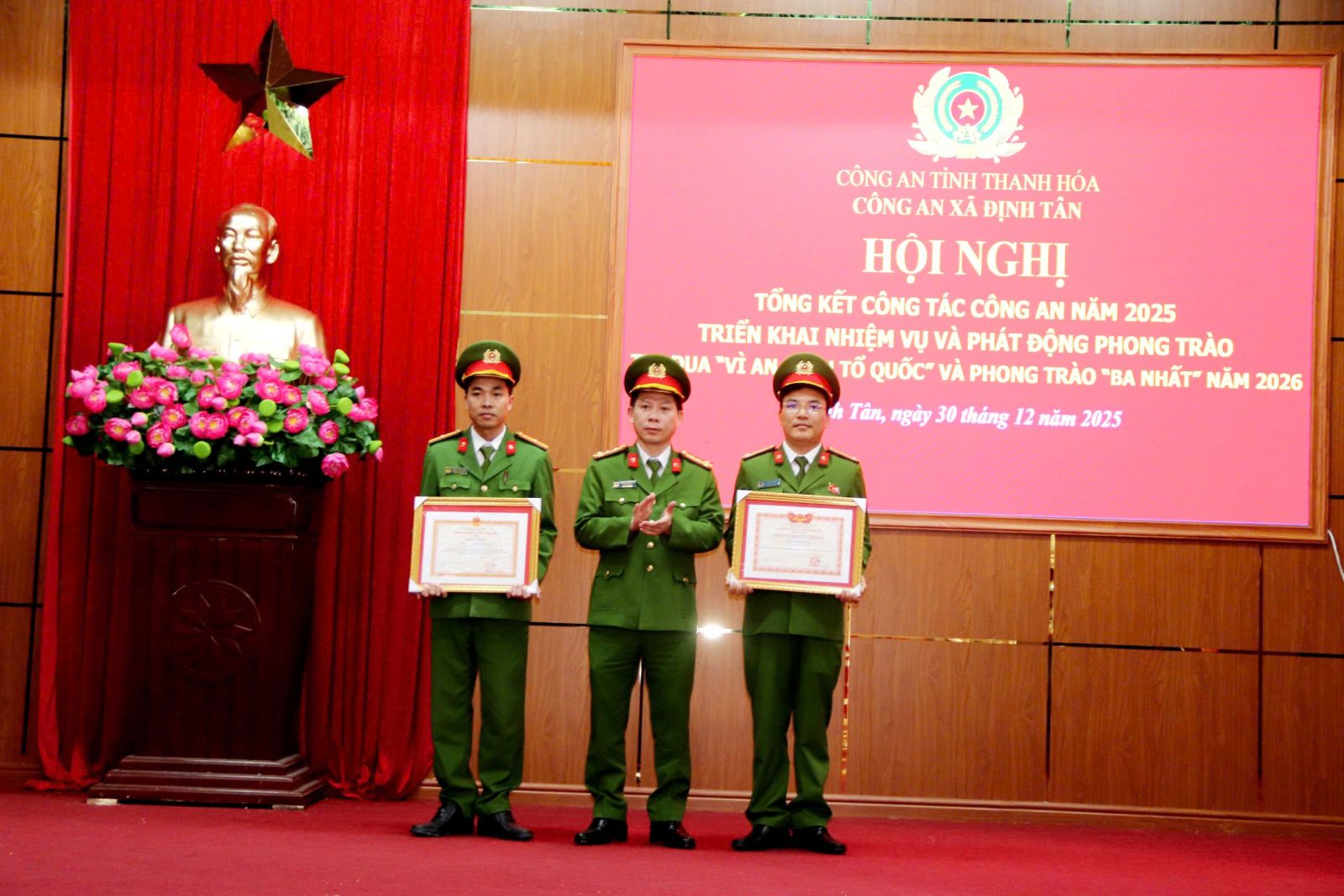 Tại Hội nghị, các đại biểu đã tập trung thảo luận, đánh giá sâu sắc những kết quả đạt được, chỉ rõ những tồn tại, hạn chế và thống nhất các giải pháp trọng tâm thực hiện nhiệm vụ năm 2026. Đồng thời, phát động phong trào thi đua “Vì an ninh Tổ quốc” với 9 nội dung trọng tâm và phong trào “Ba nhất”: Kỷ luật nhất - Trung thành nhất - Gần dân nhất”; trao khen thưởng cho các tập thể, cá nhân có thành tích xuất sắc trong thực hiện nhiệm vụ năm 2025, tạo động lực để Công an xã Định Tân tiếp tục phấn đấu hoàn thành xuất sắc nhiệm vụ trong năm 2026 và những năm tiếp theo.